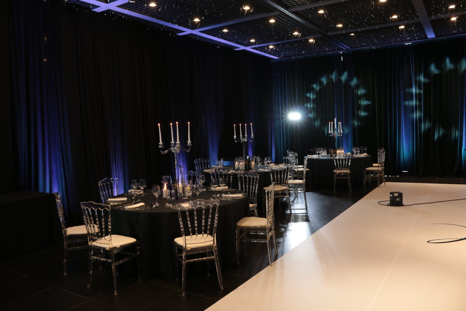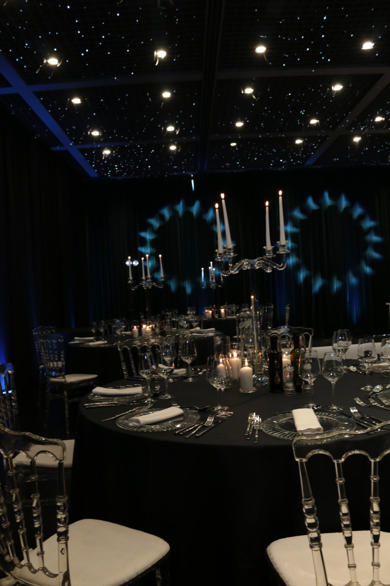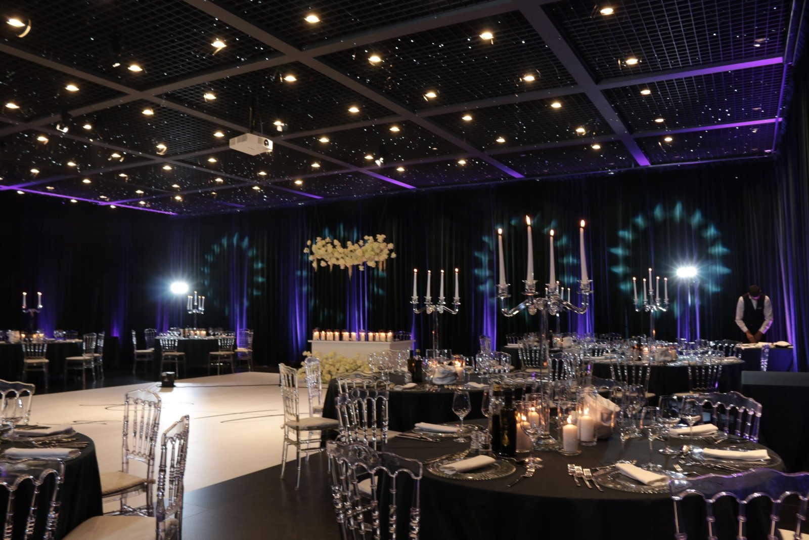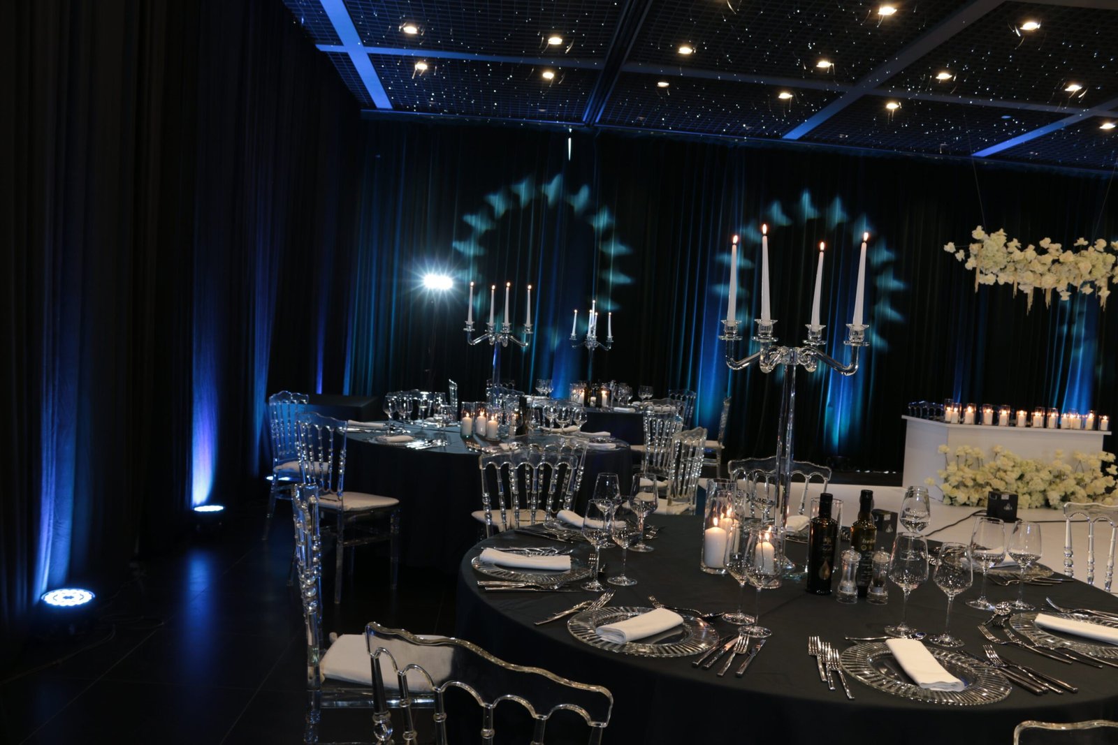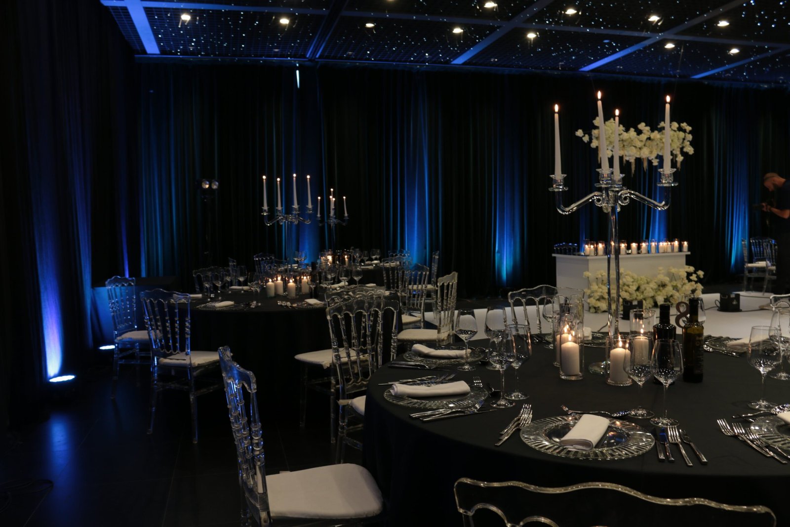 This dramatic gala dinner, designed by Kles Event, creates an atmosphere of exclusive, high-fashion glamour. Black round tables, draped in sleek linen and paired with clear acrylic chairs, are illuminated by striking silver candelabras and candlelight. The room is transformed by deep blue and purple ambient lighting, contrasting beautifully with the custom, star-lit ceiling. The overall effect is a sophisticated, upscale atmosphere, making it the perfect setting for an unforgettable corporate event, anniversary celebration, or elite private party.