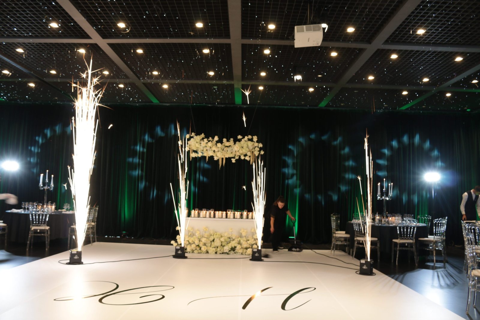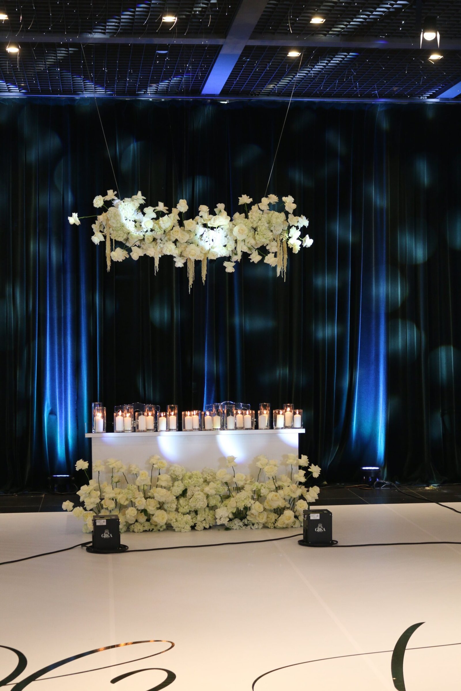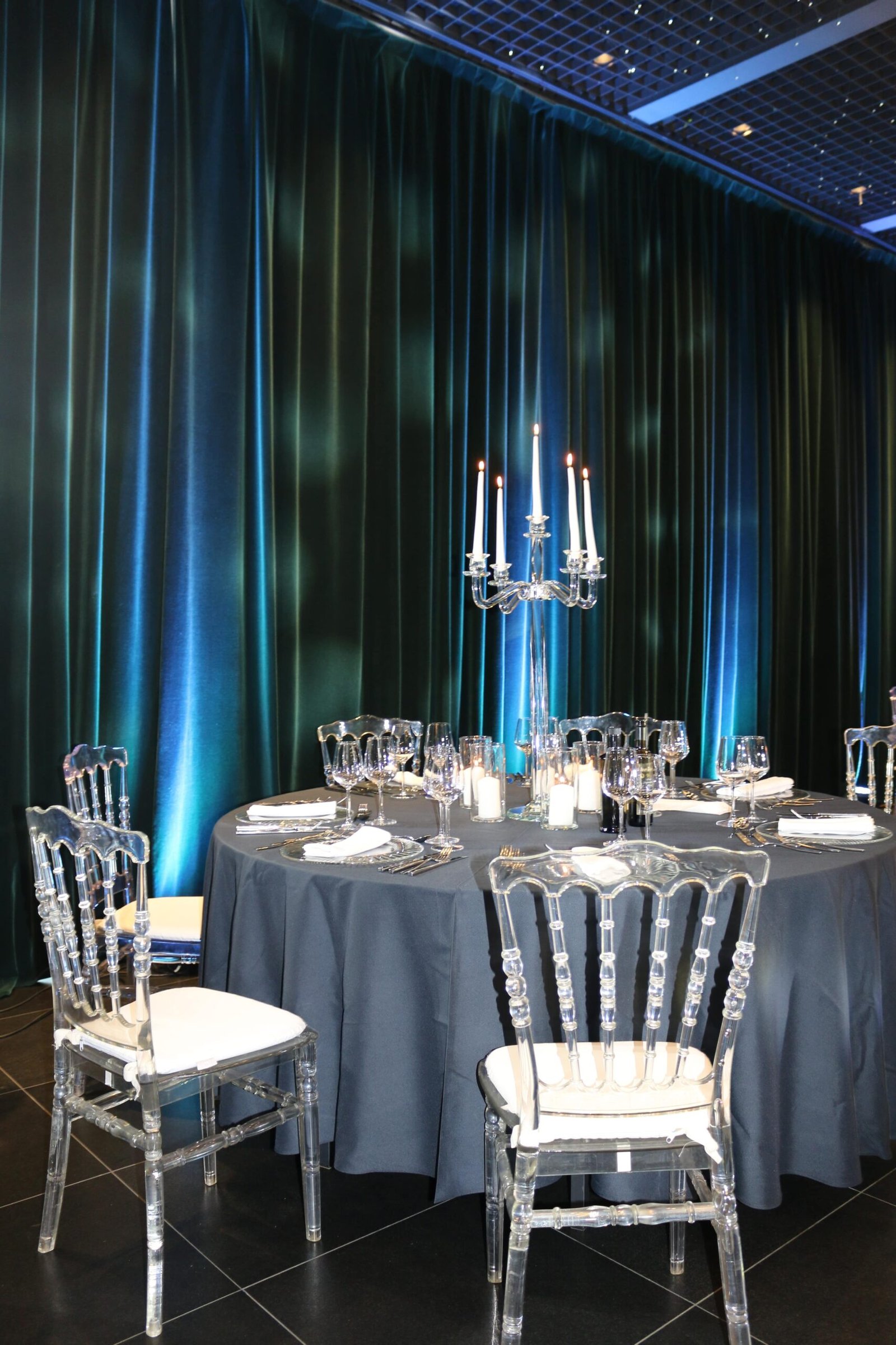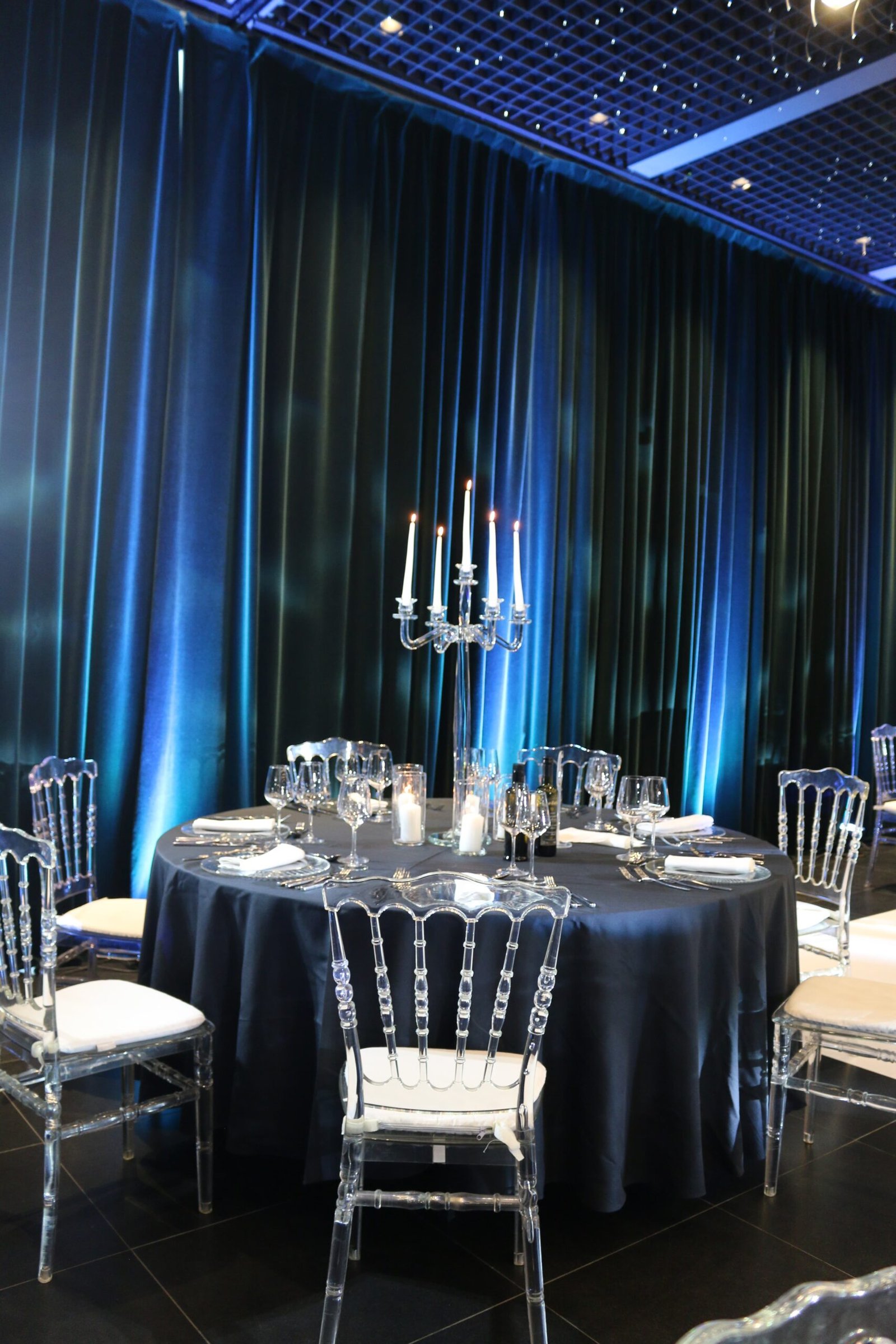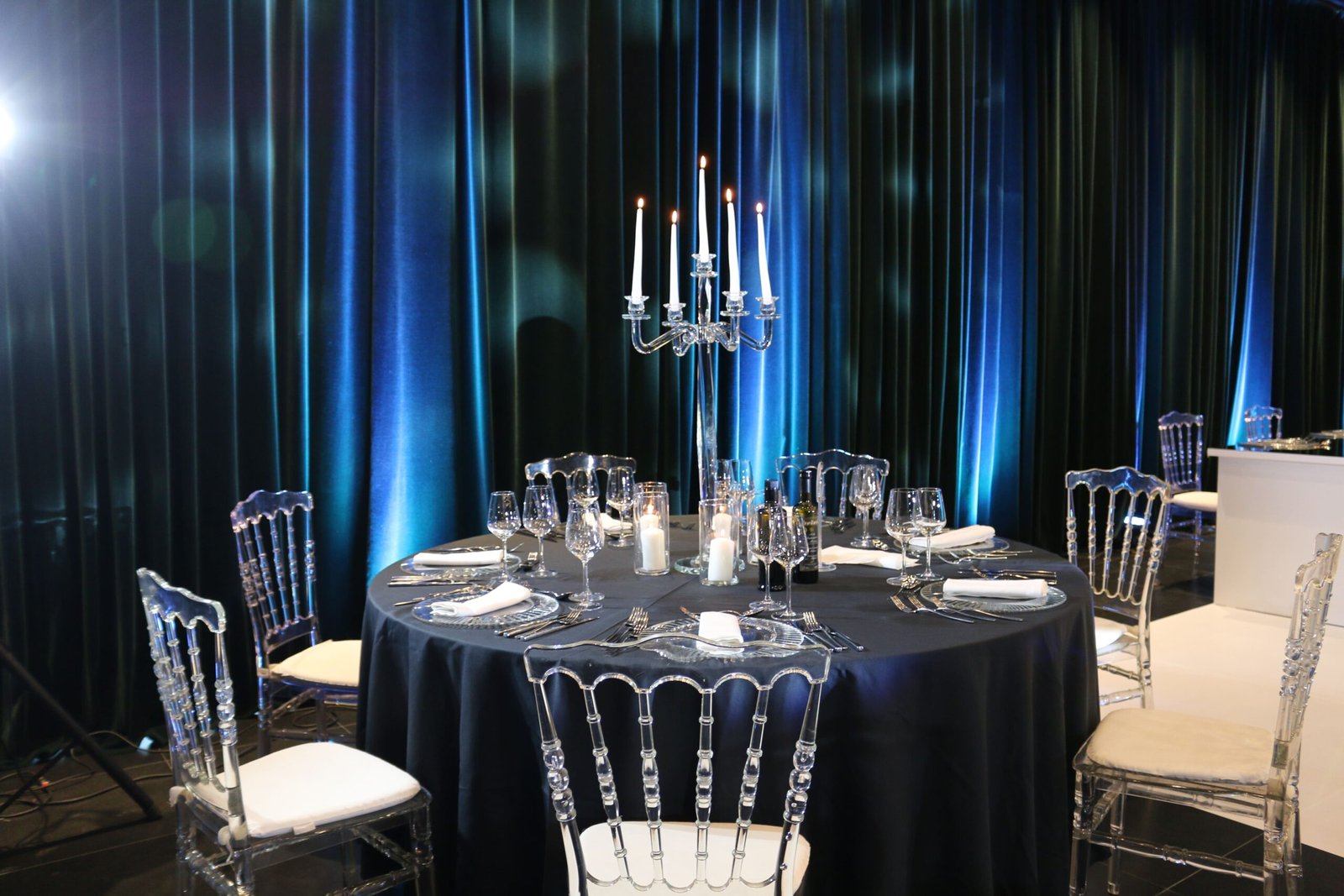 This dramatic gala dinner, designed by Kles Event, creates an atmosphere of exclusive, high-fashion glamour. Black round tables, draped in sleek linen and paired with clear acrylic chairs, are illuminated by striking silver candelabras and candlelight. The room is transformed by deep blue and purple ambient lighting, contrasting beautifully with the custom, star-lit ceiling. The overall effect is a sophisticated, upscale atmosphere, making it the perfect setting for an unforgettable corporate event, anniversary celebration, or elite private party.