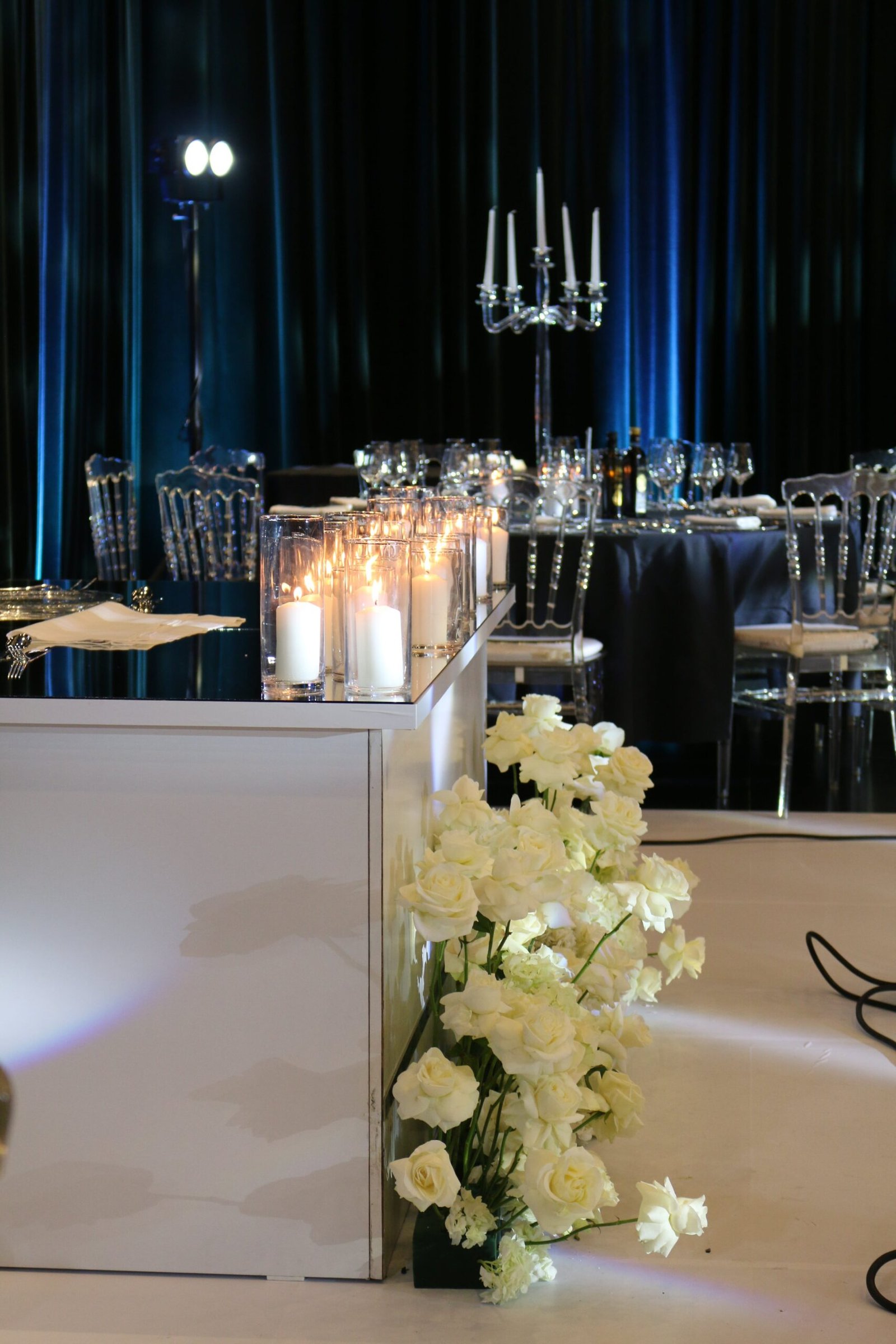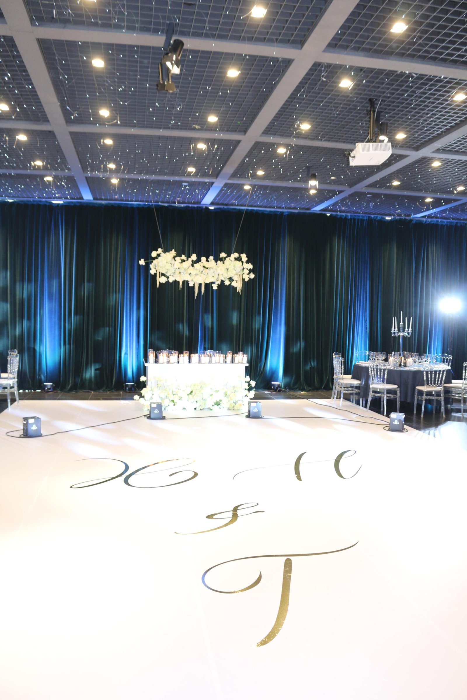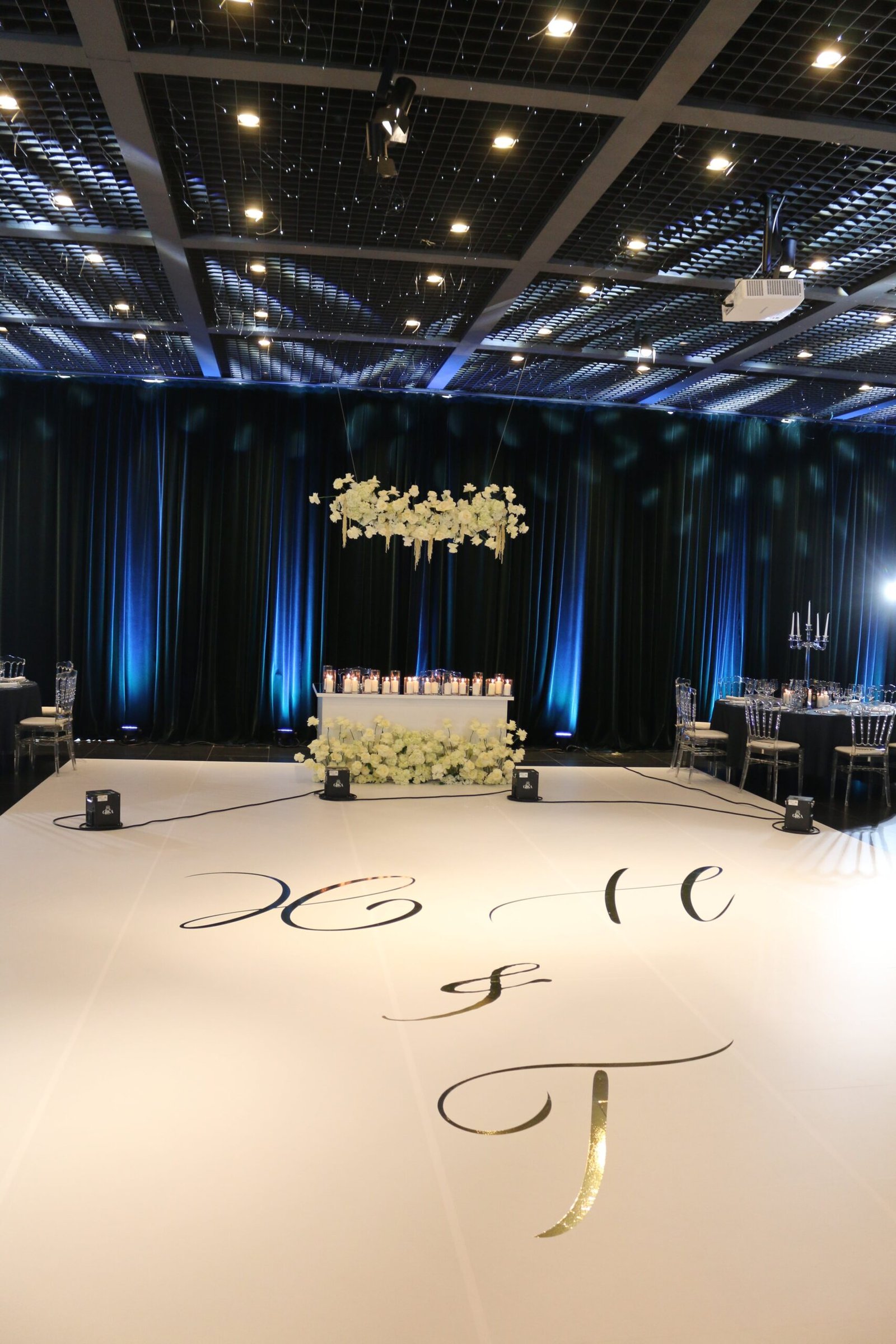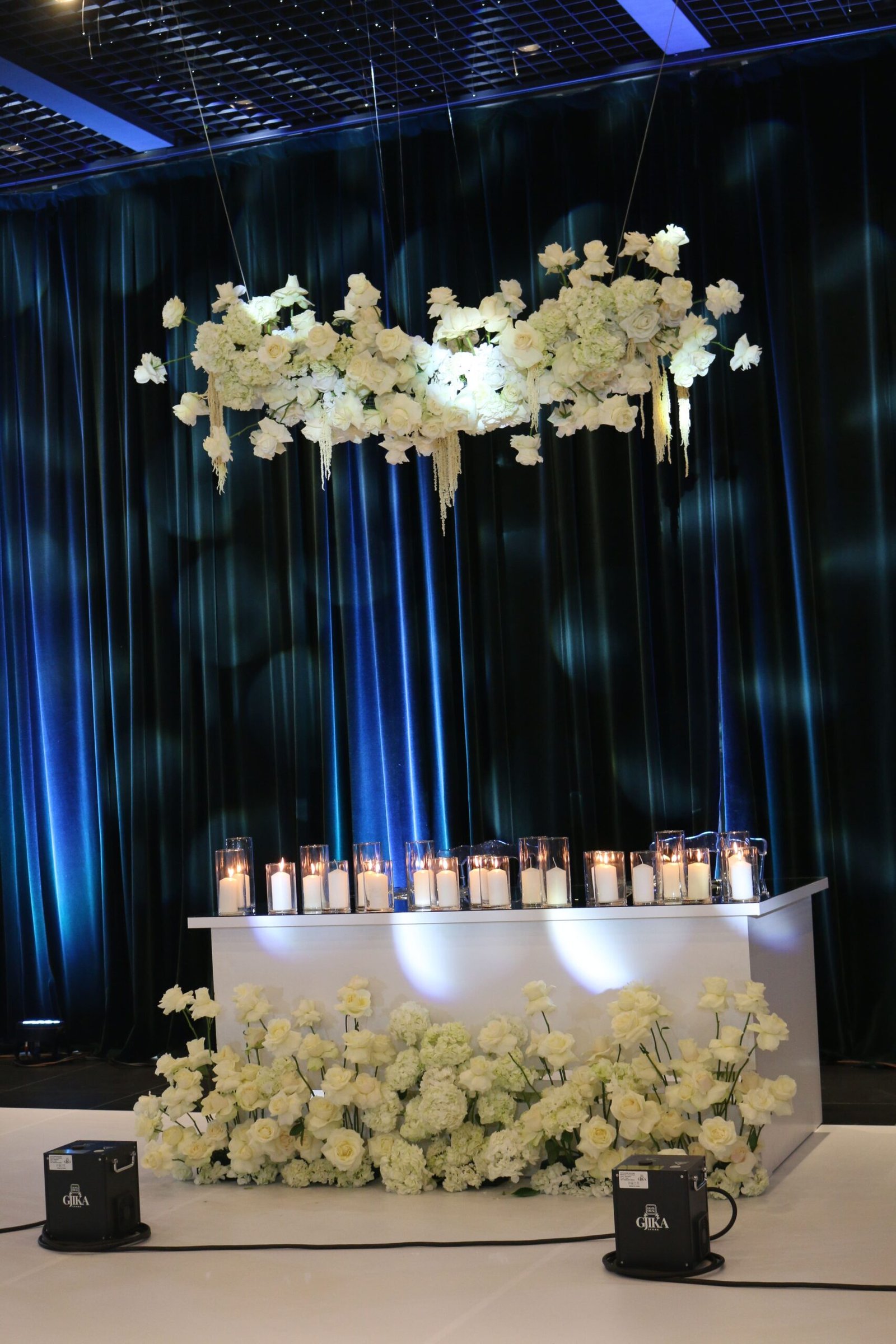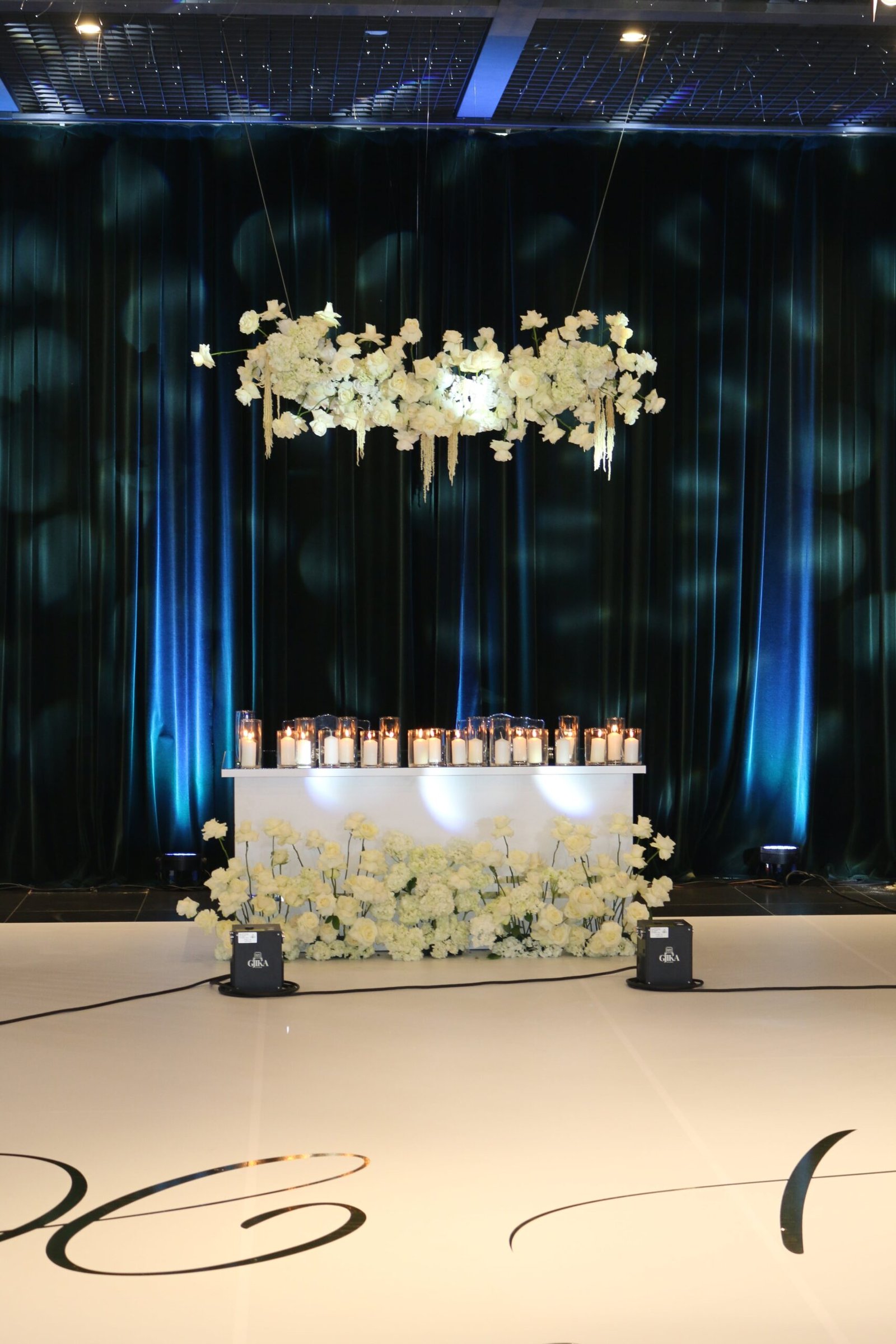 This dramatic gala dinner, designed by Kles Event, creates an atmosphere of exclusive, high-fashion glamour. Black round tables, draped in sleek linen and paired with clear acrylic chairs, are illuminated by striking silver candelabras and candlelight. The room is transformed by deep blue and purple ambient lighting, contrasting beautifully with the custom, star-lit ceiling. The overall effect is a sophisticated, upscale atmosphere, making it the perfect setting for an unforgettable corporate event, anniversary celebration, or elite private party.