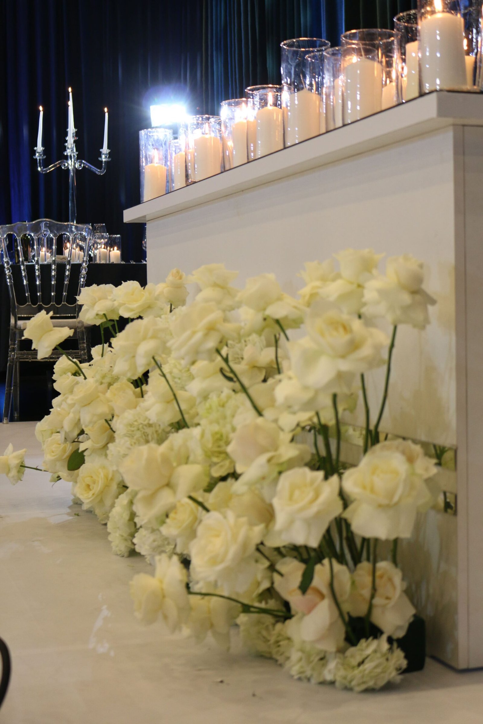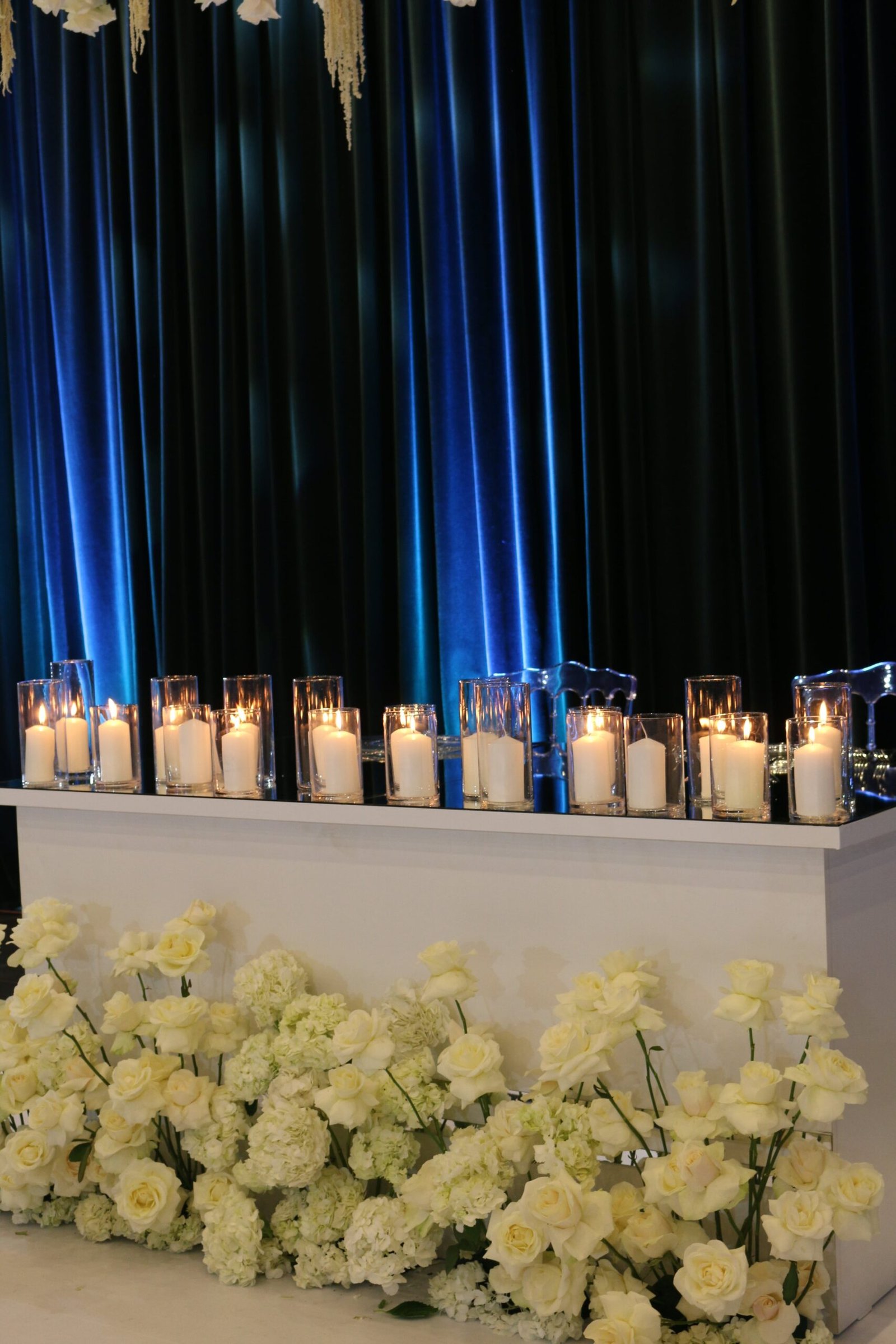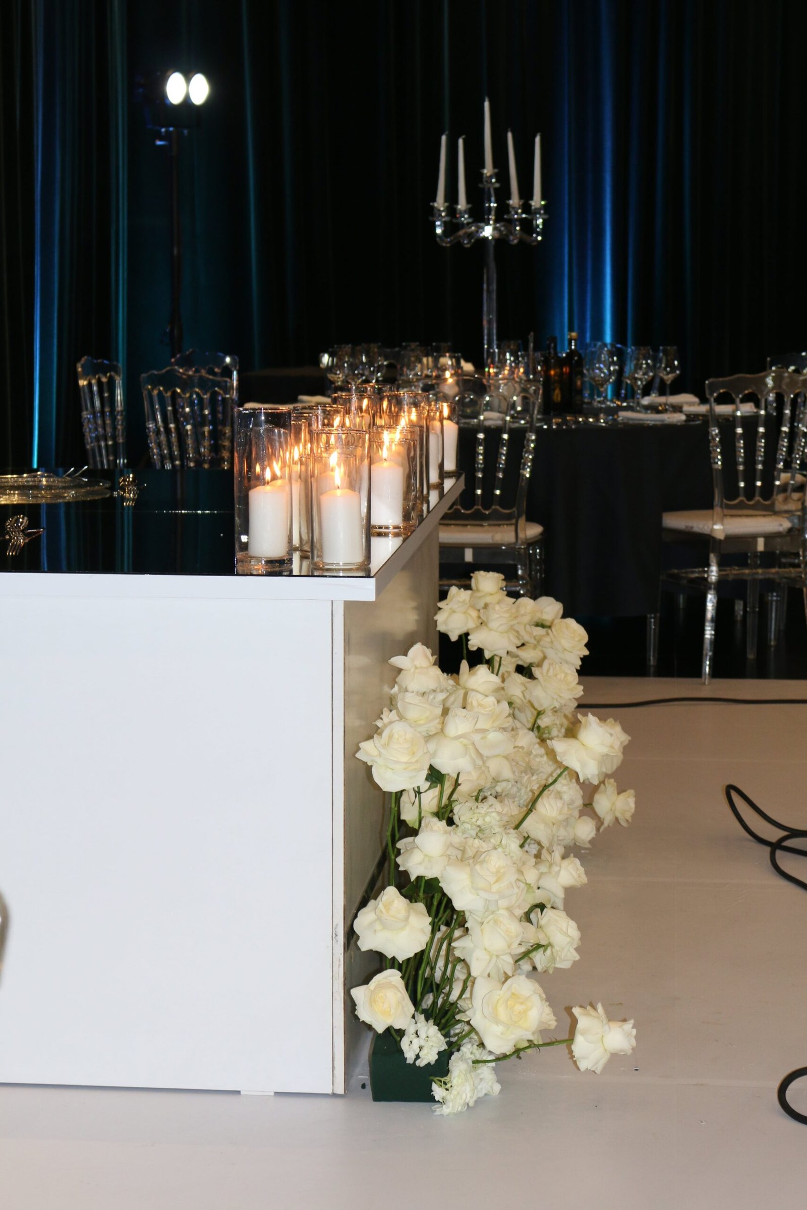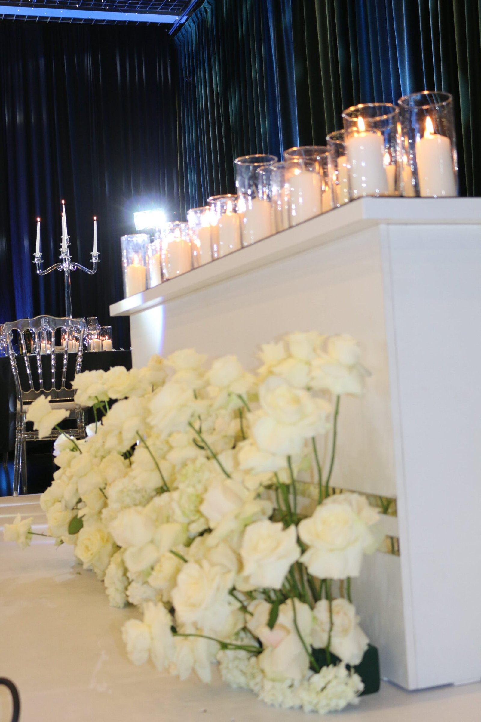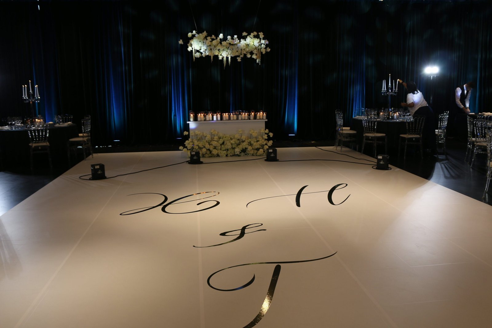 This dramatic gala dinner, designed by Kles Event, creates an atmosphere of exclusive, high-fashion glamour. Black round tables, draped in sleek linen and paired with clear acrylic chairs, are illuminated by striking silver candelabras and candlelight. The room is transformed by deep blue and purple ambient lighting, contrasting beautifully with the custom, star-lit ceiling. The overall effect is a sophisticated, upscale atmosphere, making it the perfect setting for an unforgettable corporate event, anniversary celebration, or elite private party.