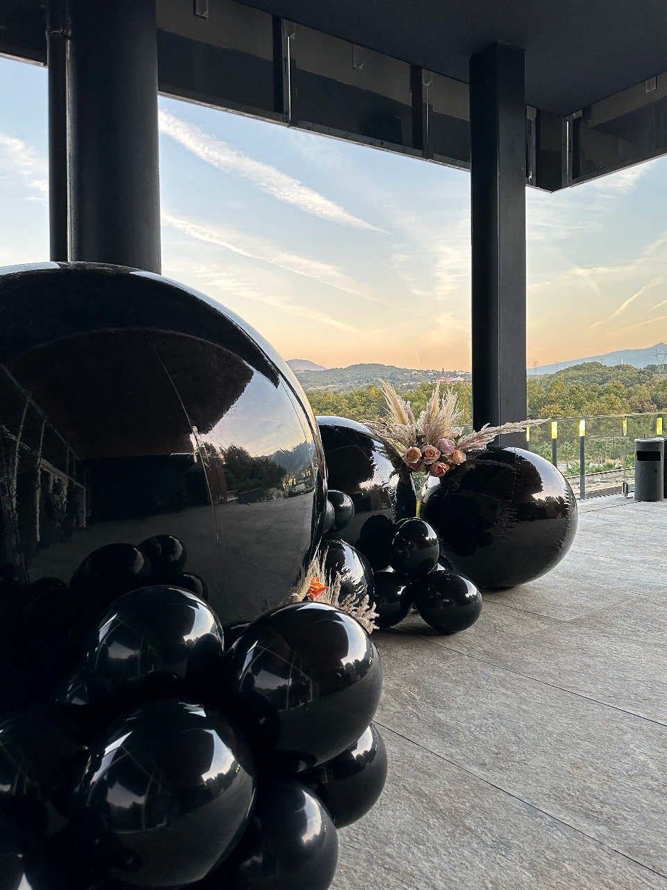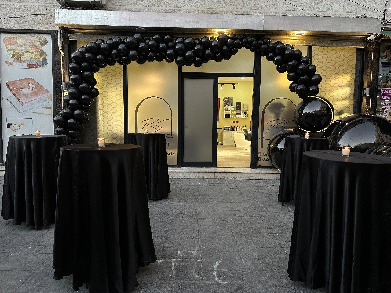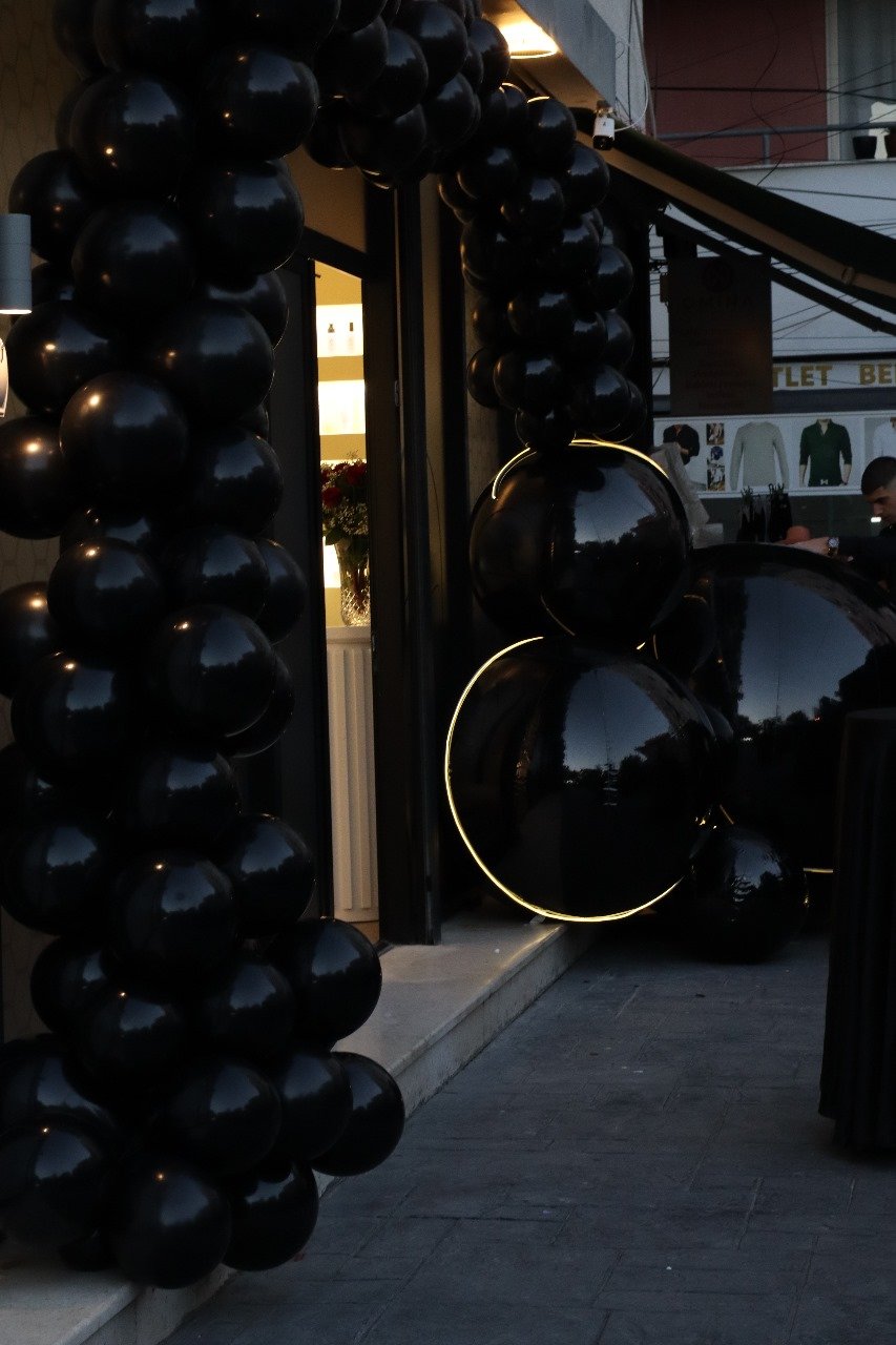 This sophisticated event, flawlessly designed by Kles Event, showcases a stunning blend of modern elegance and intimate charm. Guests are welcomed by a dramatic black balloon arch and sleek cocktail tables adorned with warm candlelight. A lavish display of savory and sweet catering offers a delightful culinary experience. Inside, the salon space is transformed with subtle floral arrangements and inviting candles, creating a warm, exclusive atmosphere. Oversized black balloons with gold accents add a touch of grand opening glamour, ensuring a memorable and stylish celebration.