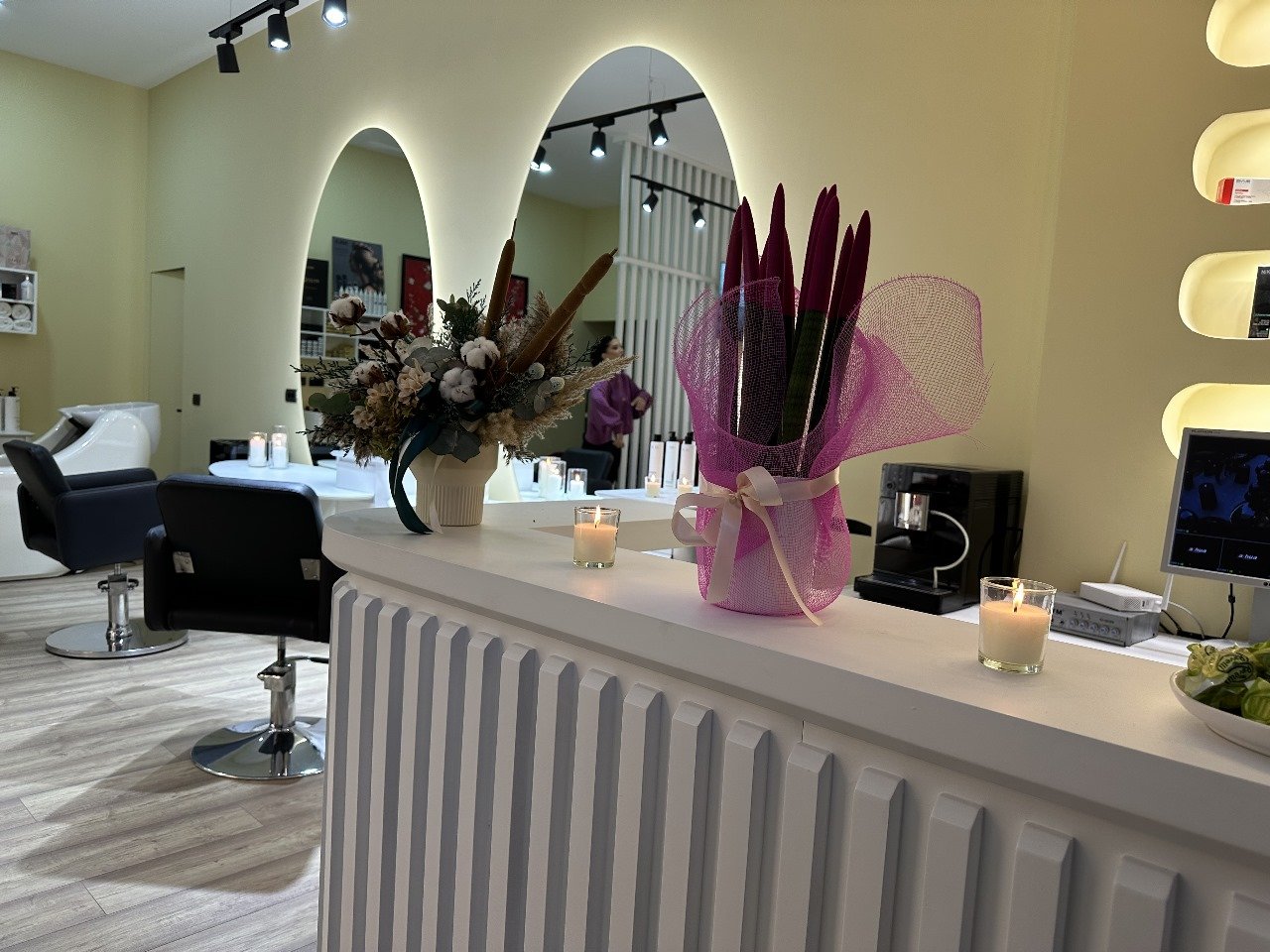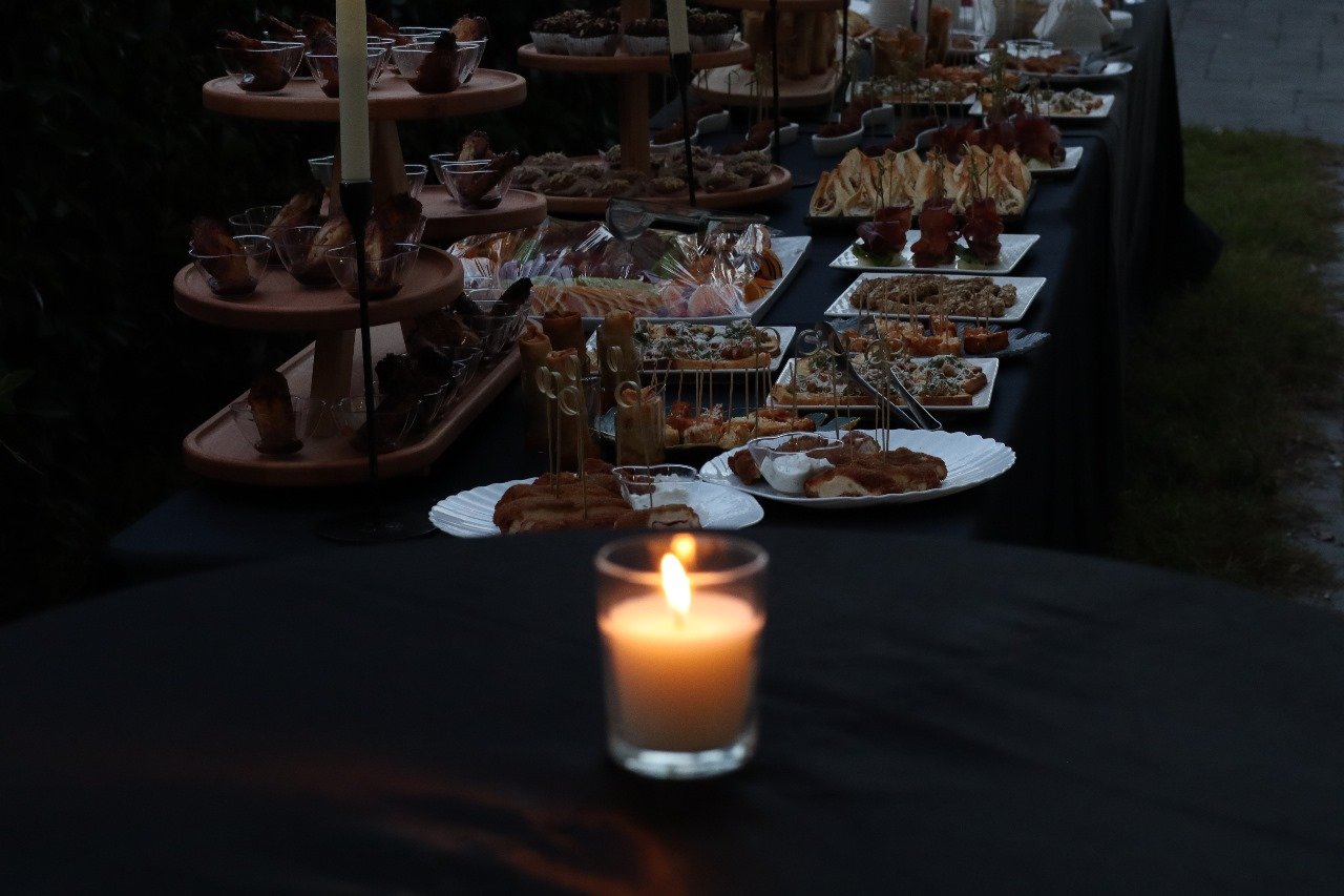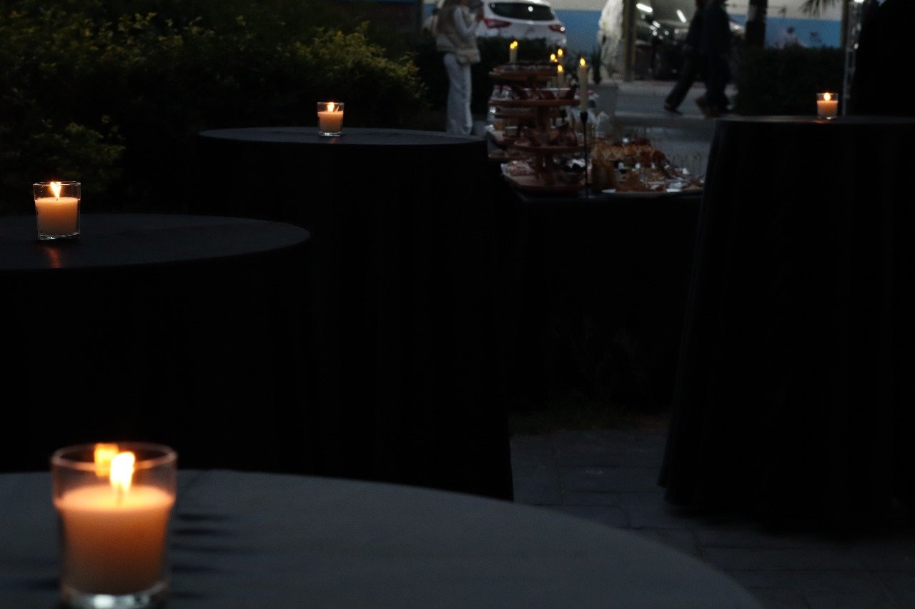This sophisticated event, flawlessly designed by Kles Event, showcases a stunning blend of modern elegance and intimate charm. Guests are welcomed by a dramatic black balloon arch and sleek cocktail tables adorned with warm candlelight. A lavish display of savory and sweet catering offers a delightful culinary experience. Inside, the salon space is transformed with subtle floral arrangements and inviting candles, creating a warm, exclusive atmosphere. Oversized black balloons with gold accents add a touch of grand opening glamour, ensuring a memorable and stylish celebration.