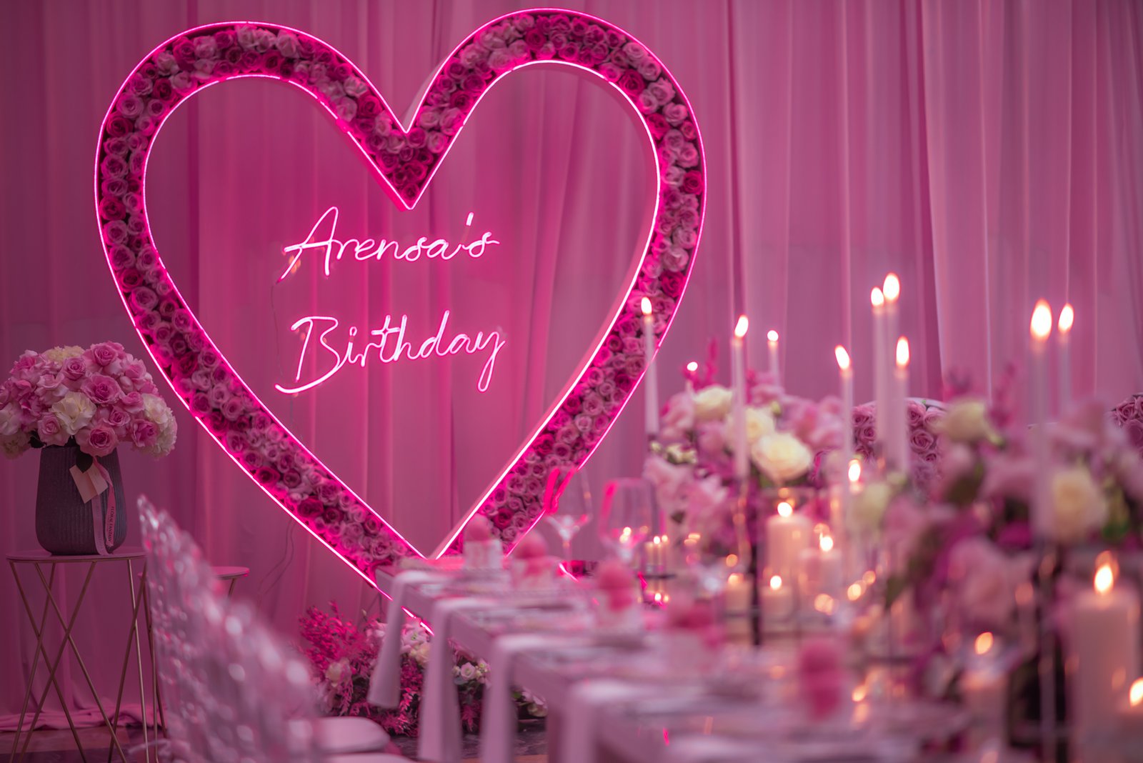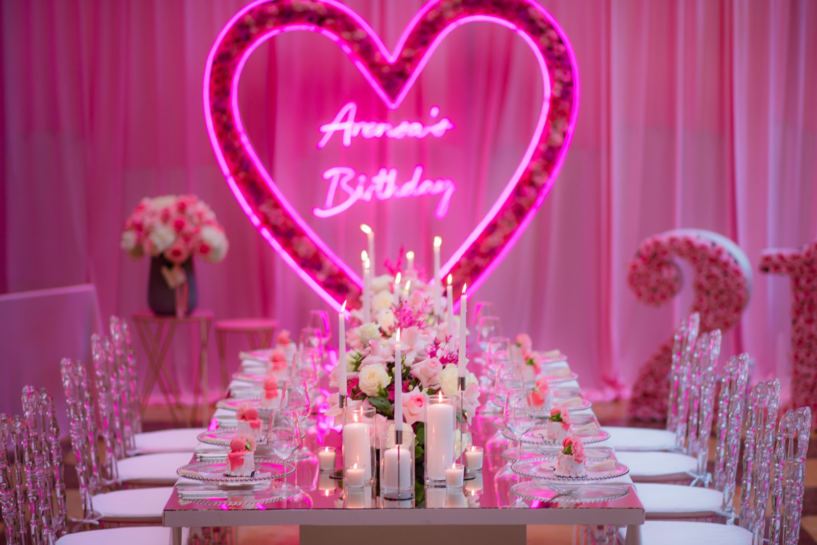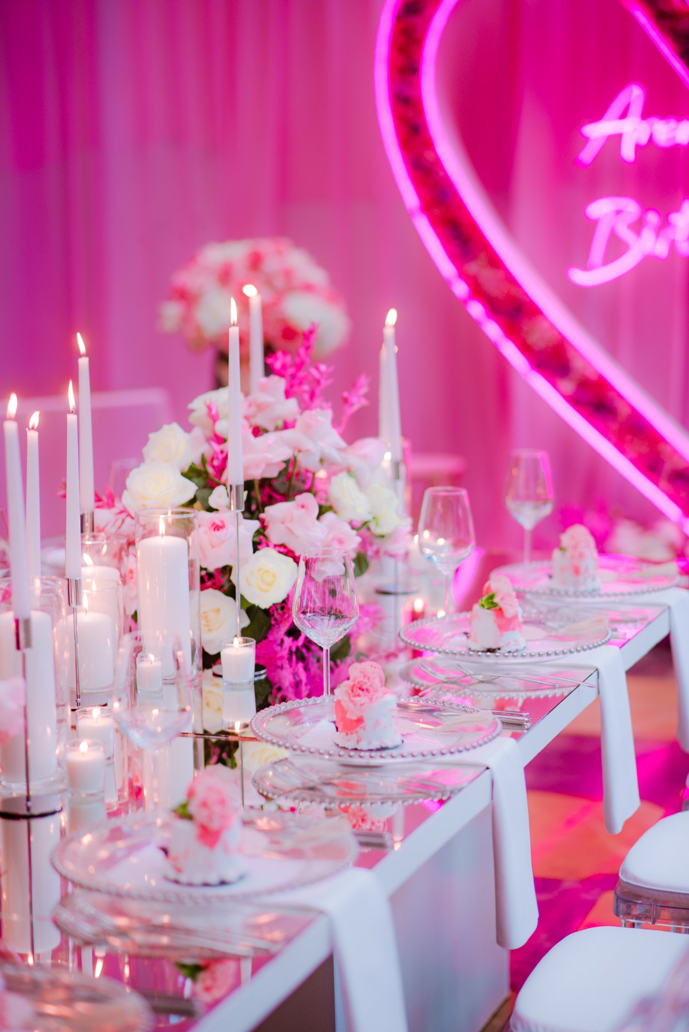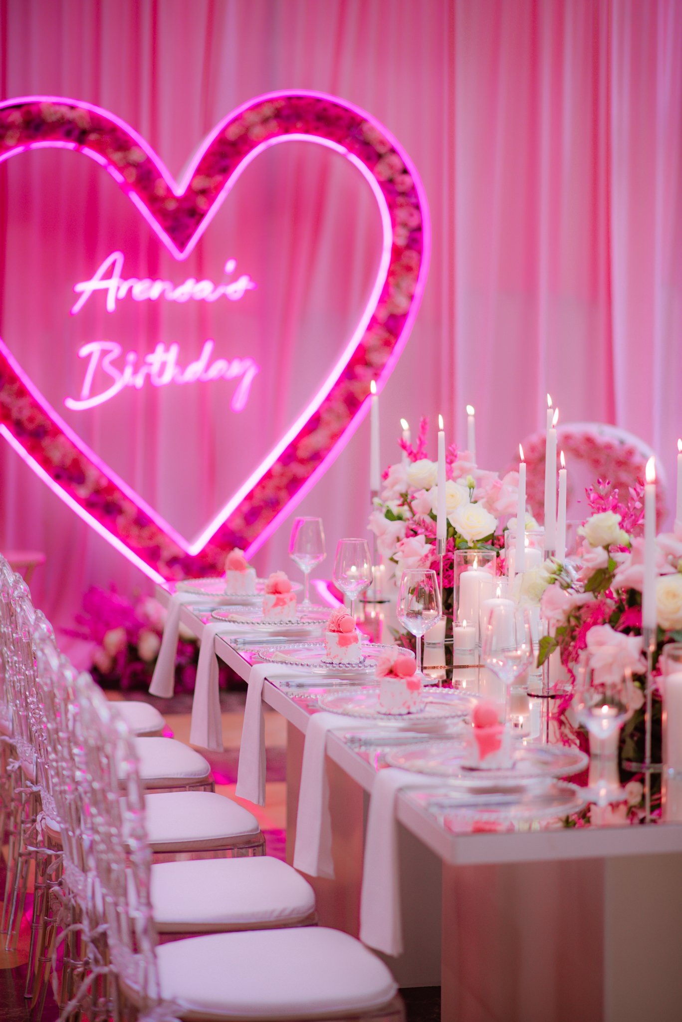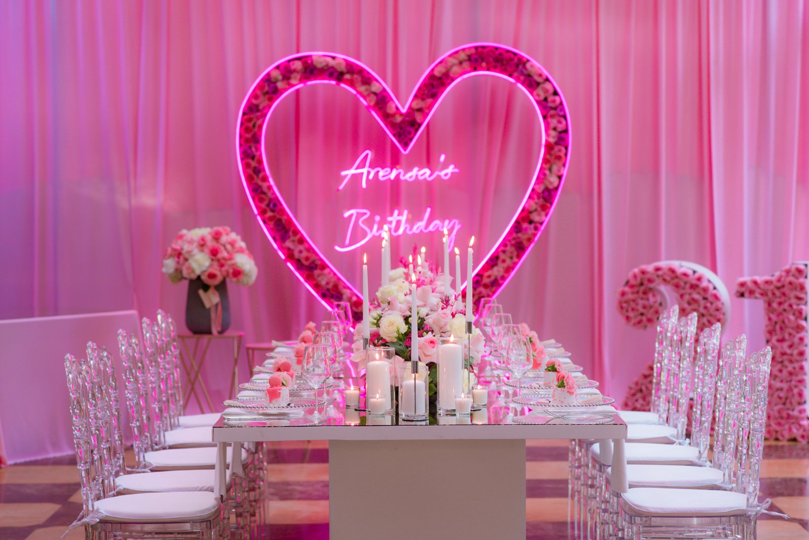 Step into a world of dazzling pink and romantic elegance for Arensa’s Birthday celebration! This stunning event features a central, vibrant pink neon heart sign, perfectly set against flowing pink drapery. The mirrored dining table creates a spectacular reflection of the exquisite decor. Guests were treated to an intimate setting with clear, ghost-style chairs and a breathtaking centerpiece arrangement of white and pale pink roses, interspersed with soft candlelight. Every detail, from the delicate floral touches on the individual place settings to the lush atmosphere, was designed to create an unforgettable, glamorous, and utterly chic birthday experience