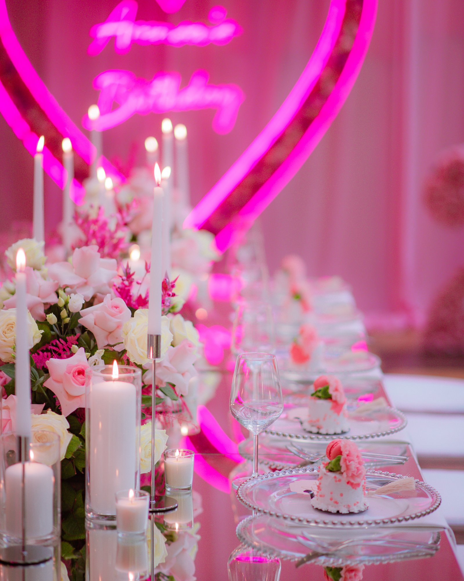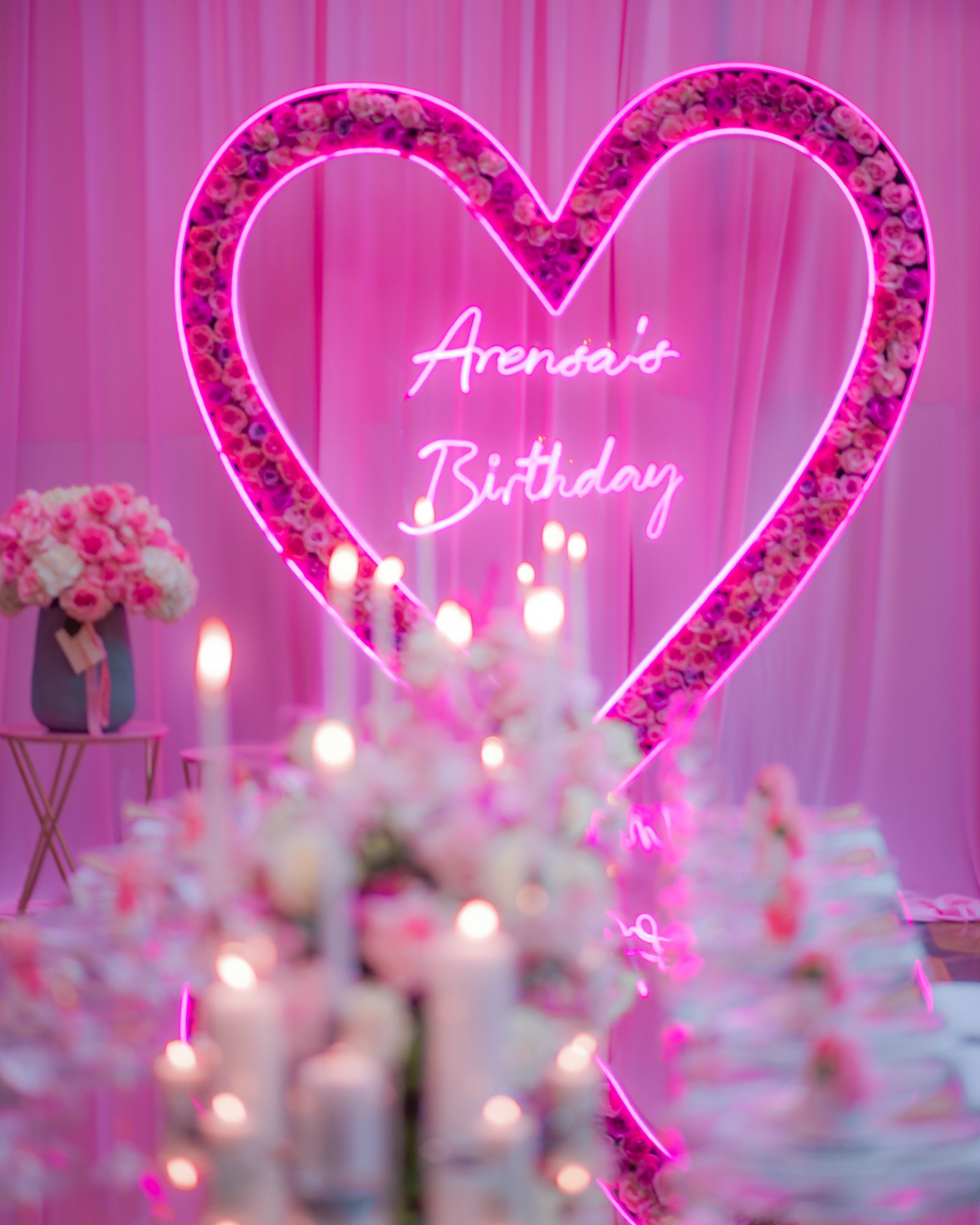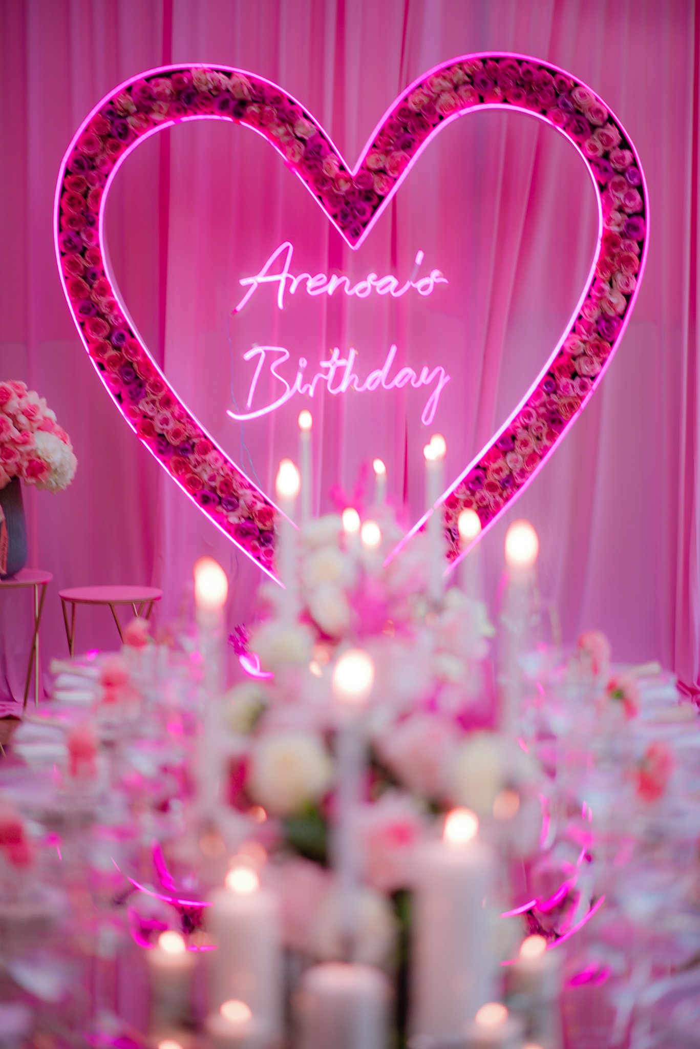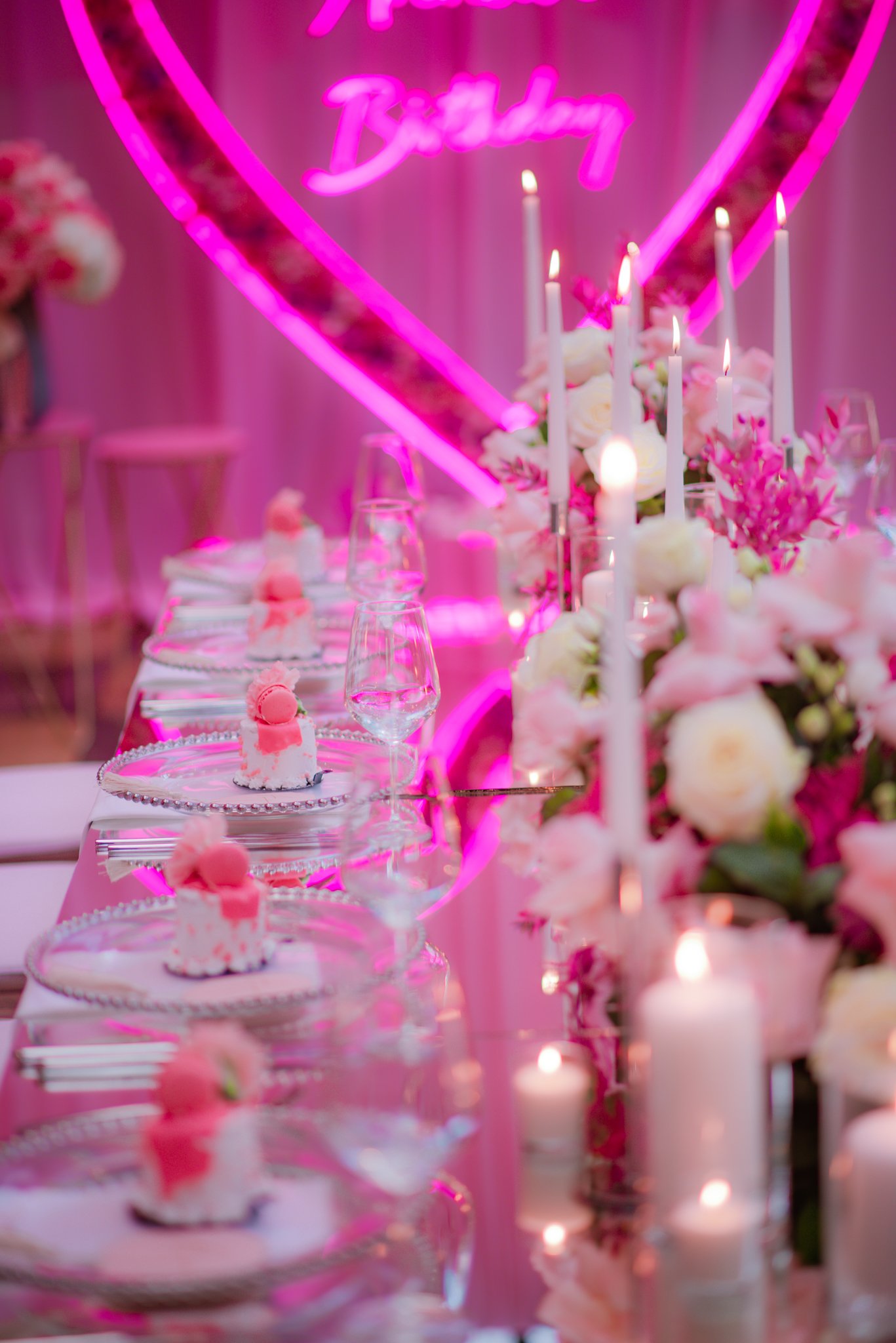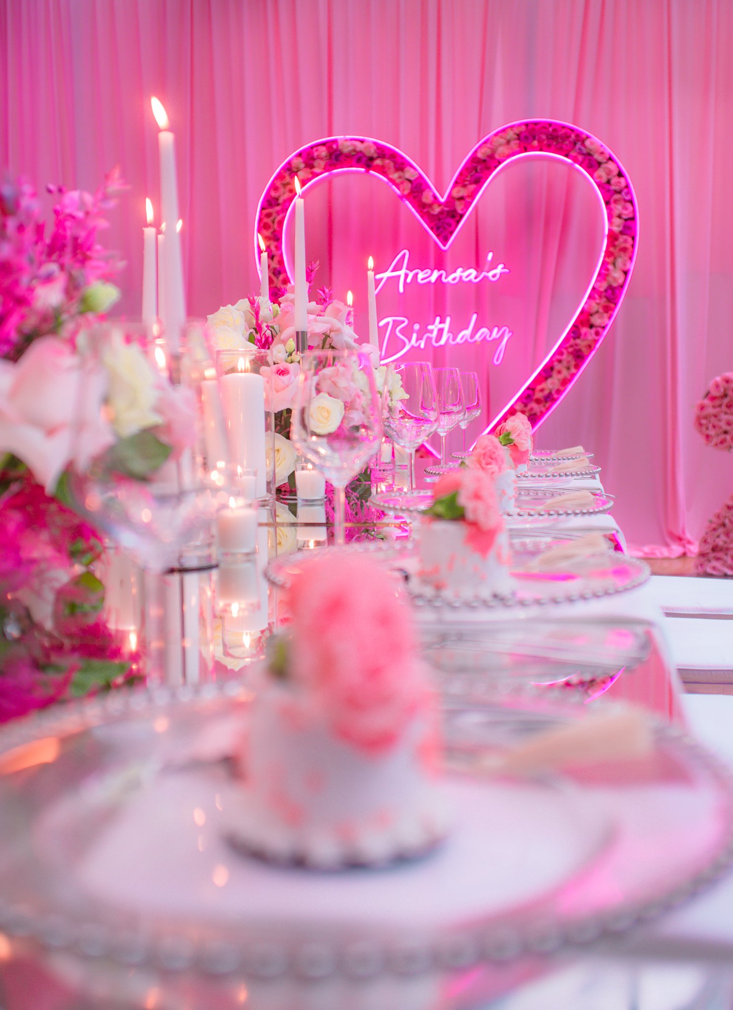 Step into a world of dazzling pink and romantic elegance for Arensa’s Birthday celebration! This stunning event features a central, vibrant pink neon heart sign, perfectly set against flowing pink drapery. The mirrored dining table creates a spectacular reflection of the exquisite decor. Guests were treated to an intimate setting with clear, ghost-style chairs and a breathtaking centerpiece arrangement of white and pale pink roses, interspersed with soft candlelight. Every detail, from the delicate floral touches on the individual place settings to the lush atmosphere, was designed to create an unforgettable, glamorous, and utterly chic birthday experience
