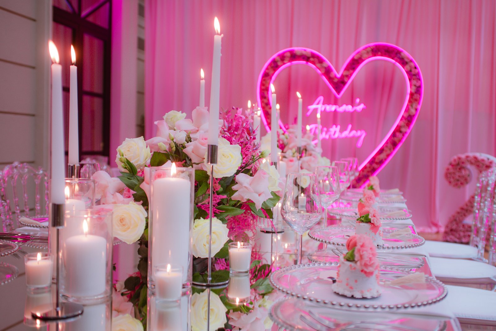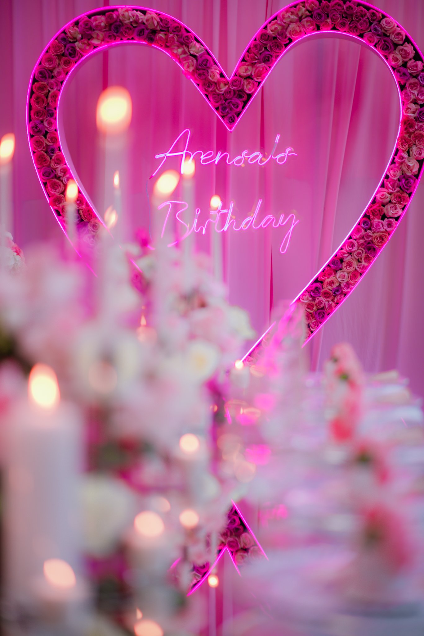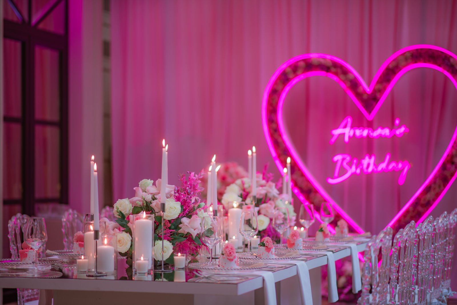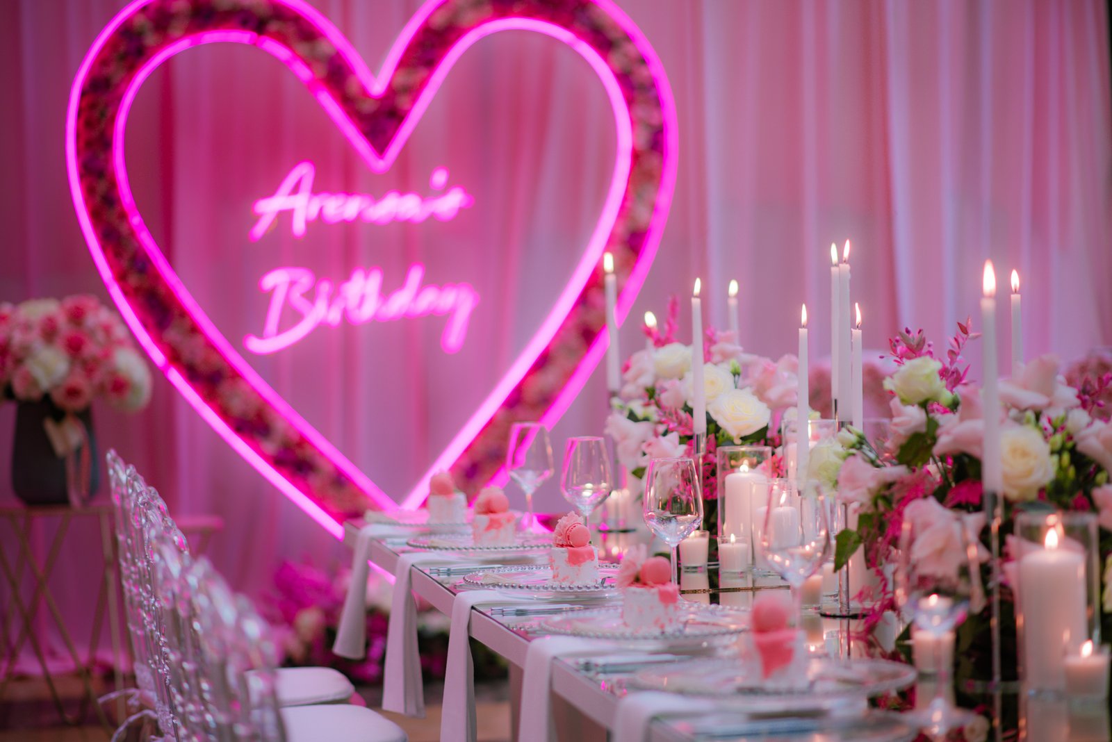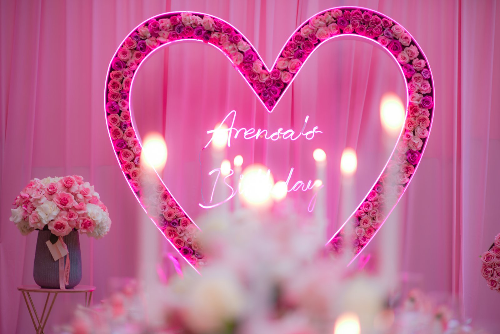 Step into a world of dazzling pink and romantic elegance for Arensa’s Birthday celebration! This stunning event features a central, vibrant pink neon heart sign, perfectly set against flowing pink drapery. The mirrored dining table creates a spectacular reflection of the exquisite decor. Guests were treated to an intimate setting with clear, ghost-style chairs and a breathtaking centerpiece arrangement of white and pale pink roses, interspersed with soft candlelight. Every detail, from the delicate floral touches on the individual place settings to the lush atmosphere, was designed to create an unforgettable, glamorous, and utterly chic birthday experience