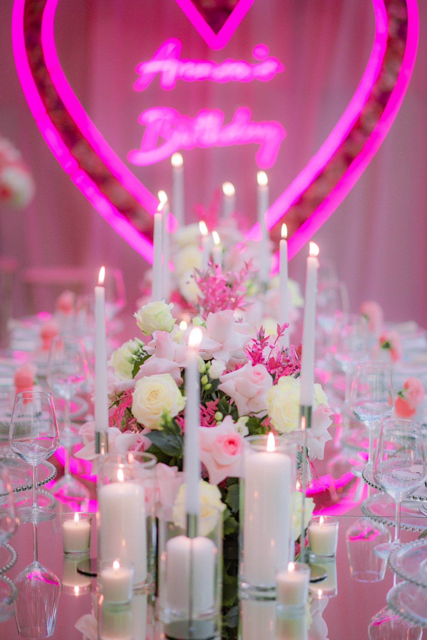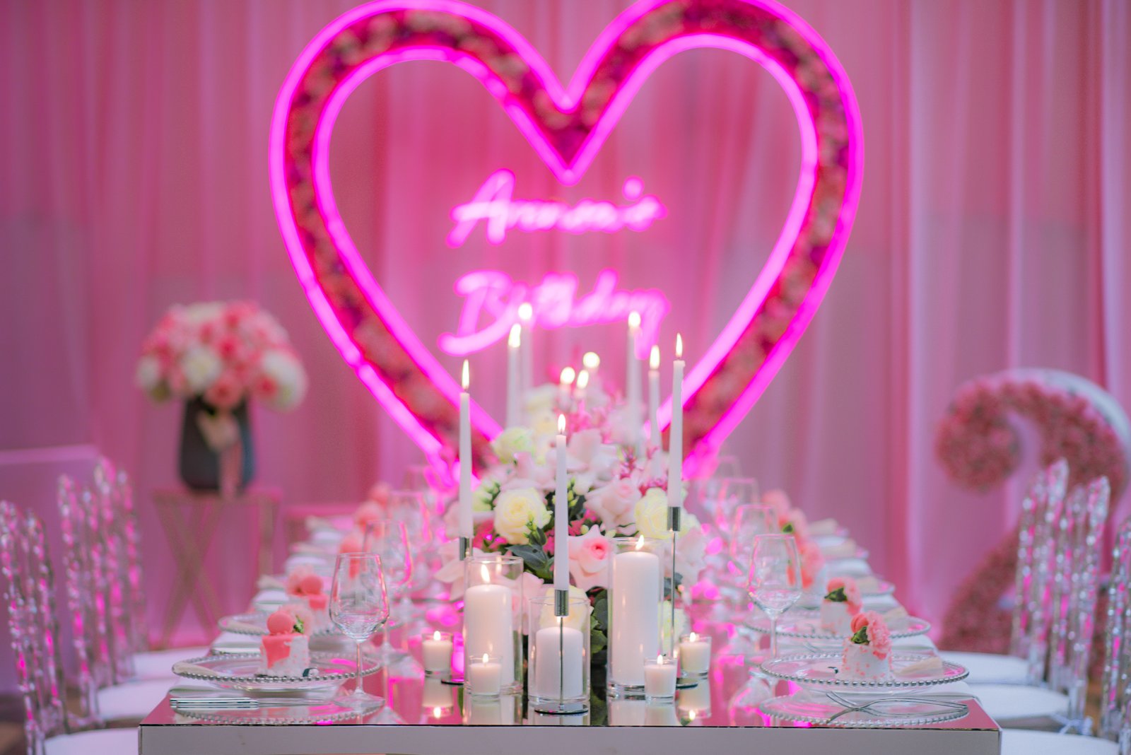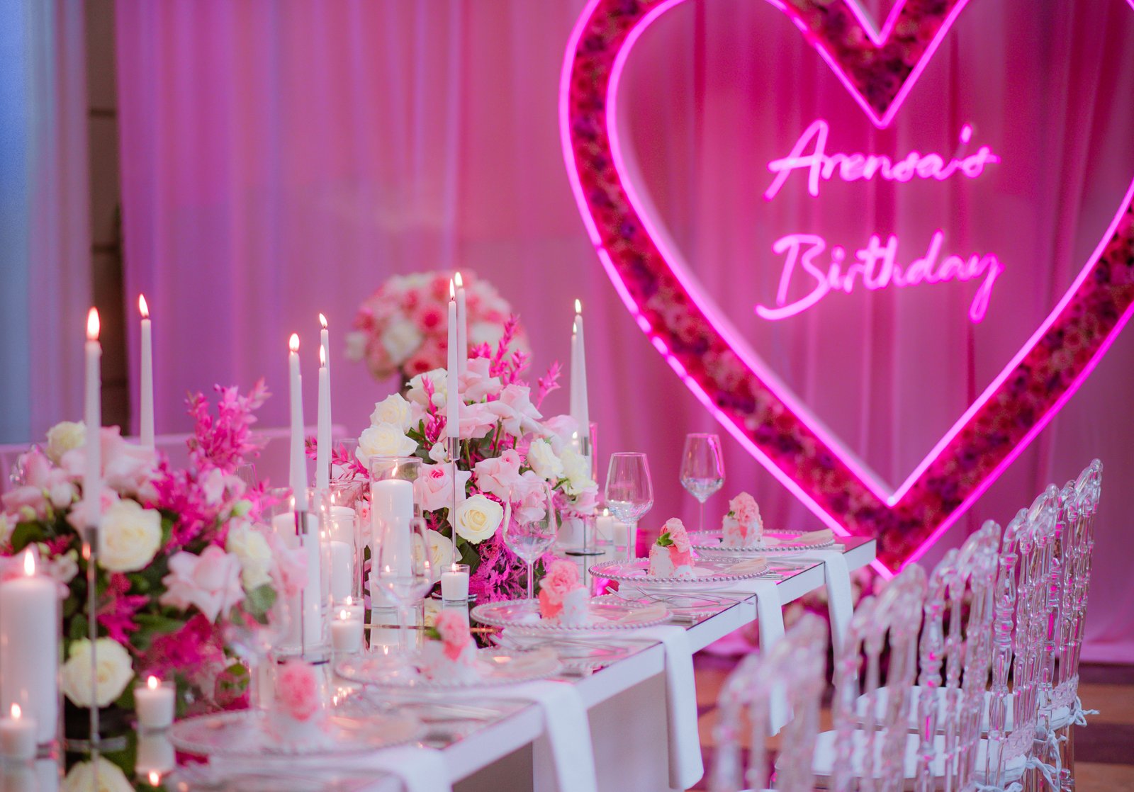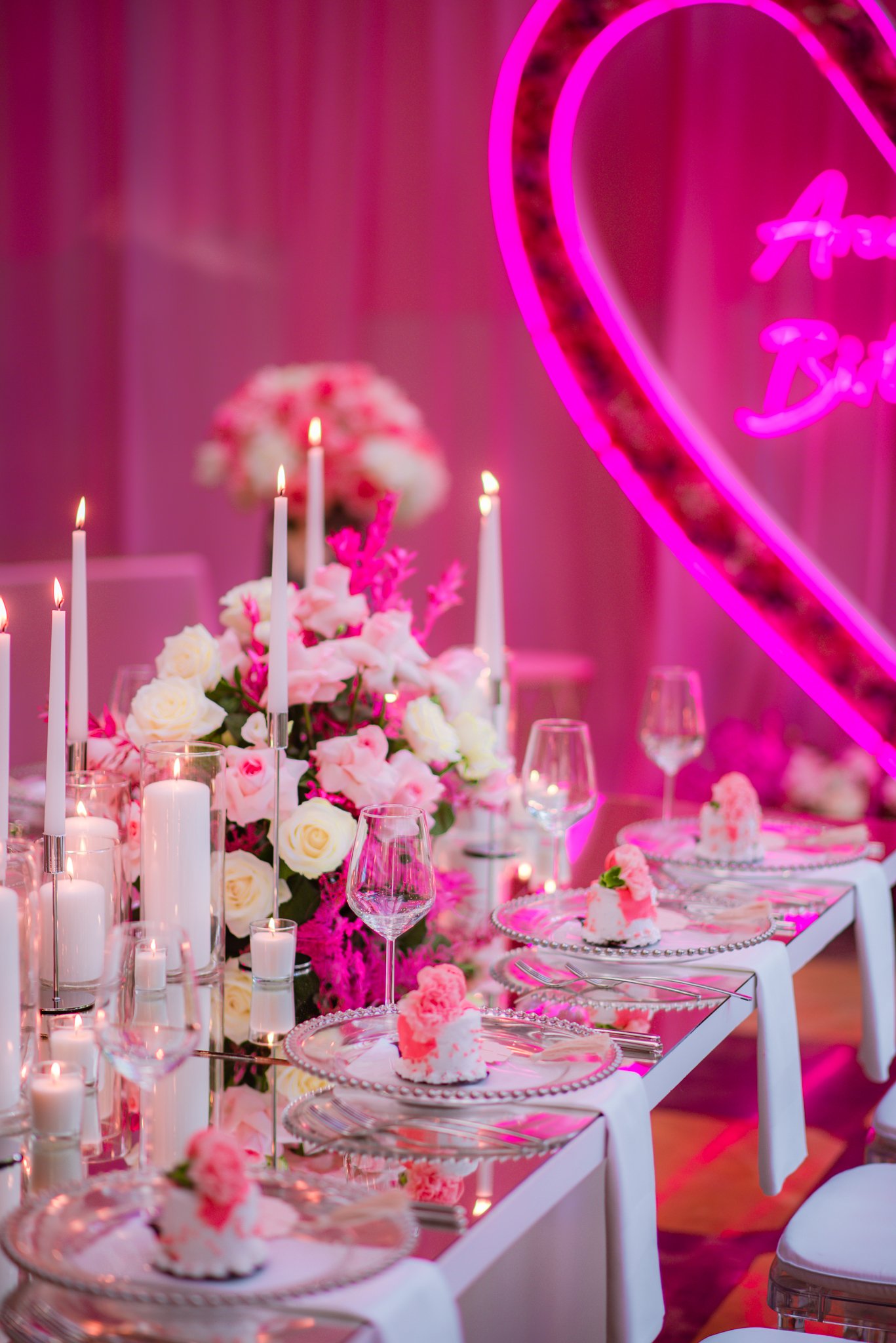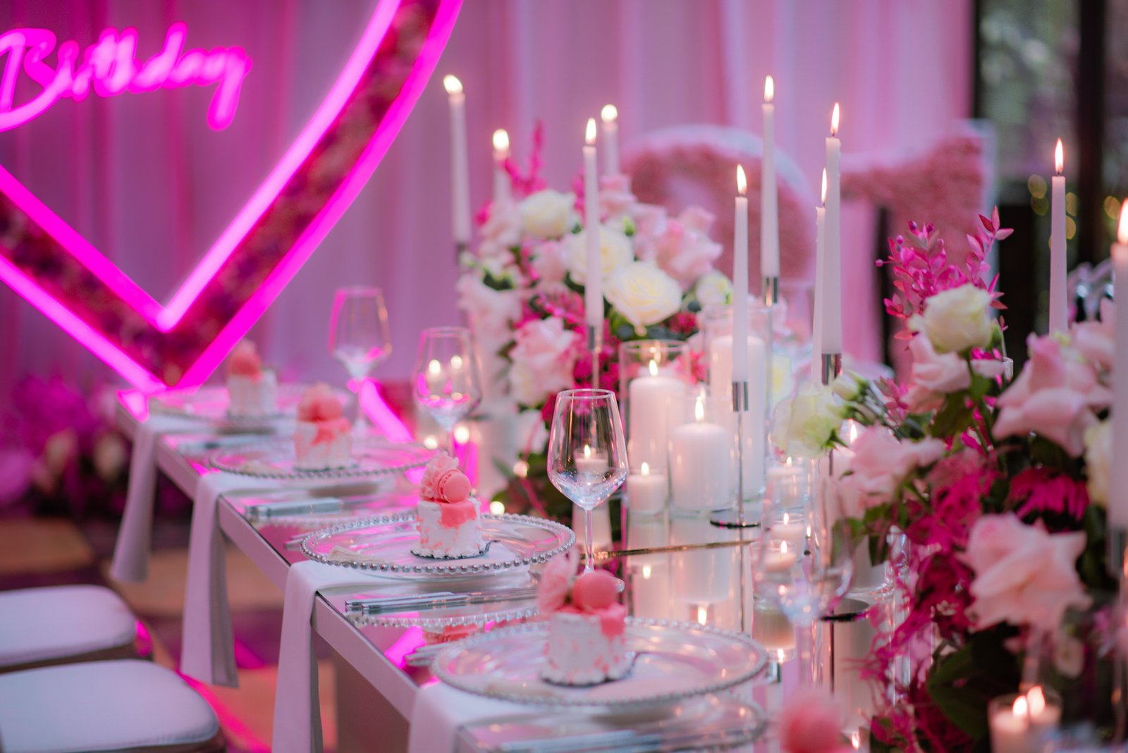 Step into a world of dazzling pink and romantic elegance for Arensa’s Birthday celebration! This stunning event features a central, vibrant pink neon heart sign, perfectly set against flowing pink drapery. The mirrored dining table creates a spectacular reflection of the exquisite decor. Guests were treated to an intimate setting with clear, ghost-style chairs and a breathtaking centerpiece arrangement of white and pale pink roses, interspersed with soft candlelight. Every detail, from the delicate floral touches on the individual place settings to the lush atmosphere, was designed to create an unforgettable, glamorous, and utterly chic birthday experience