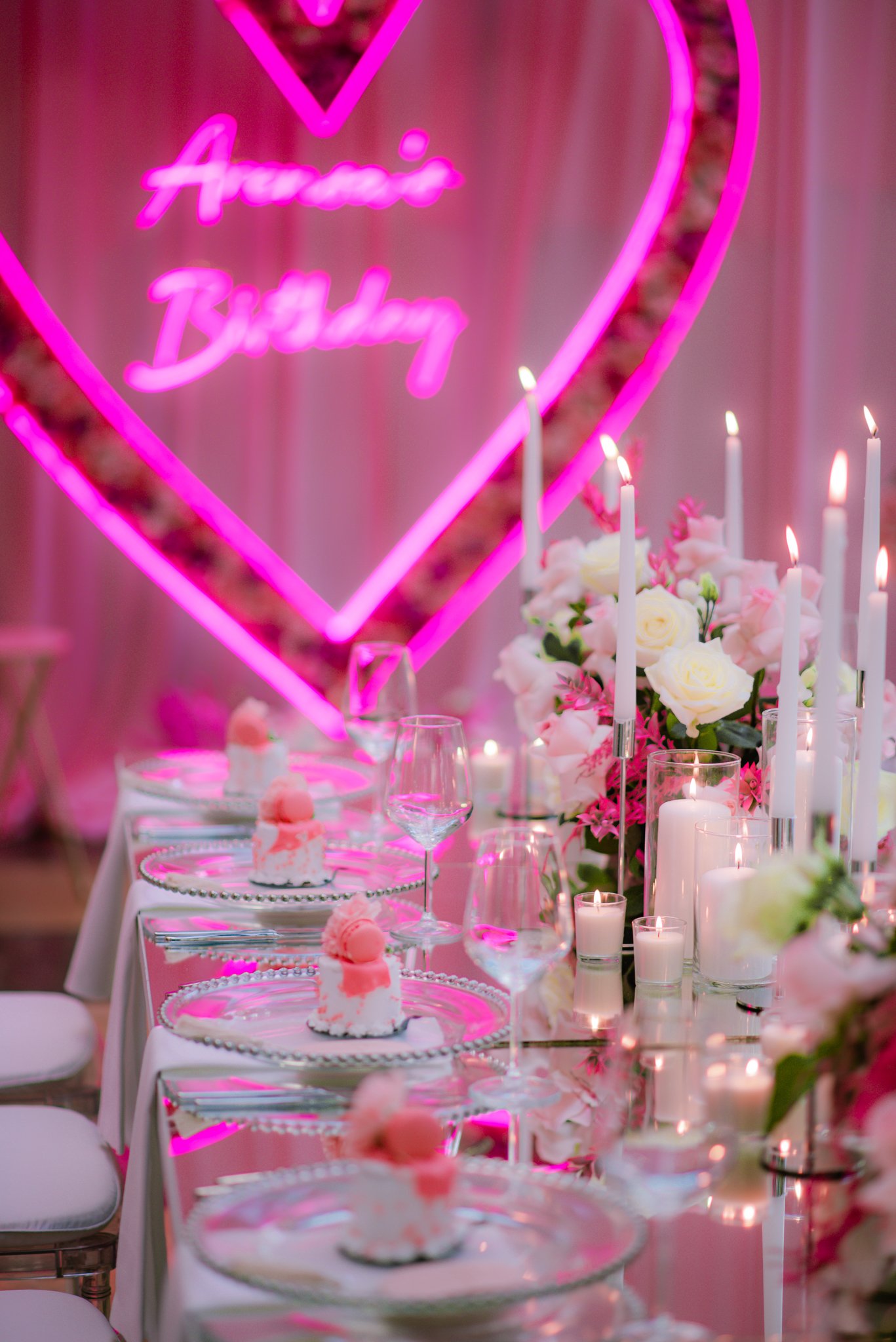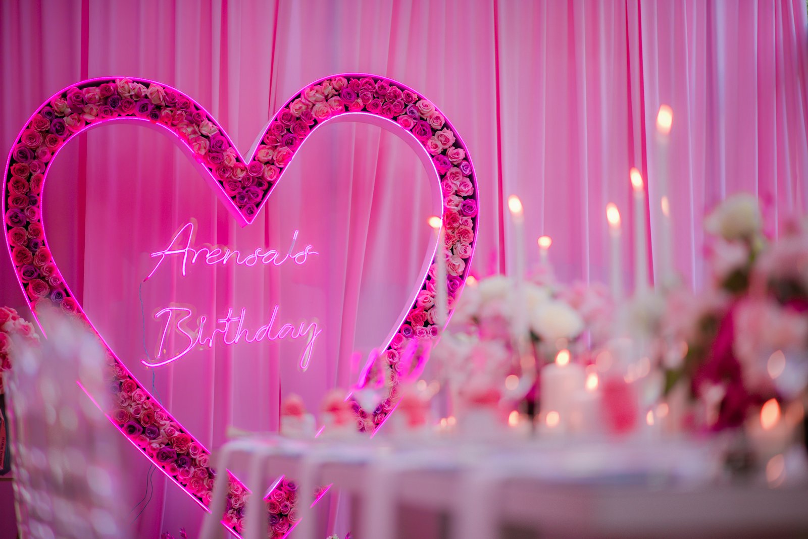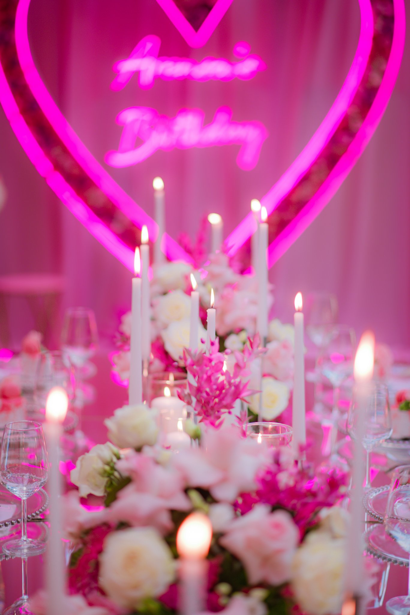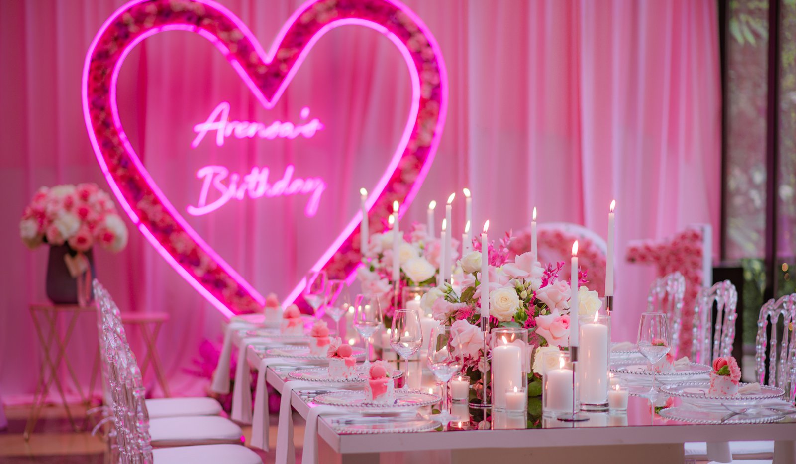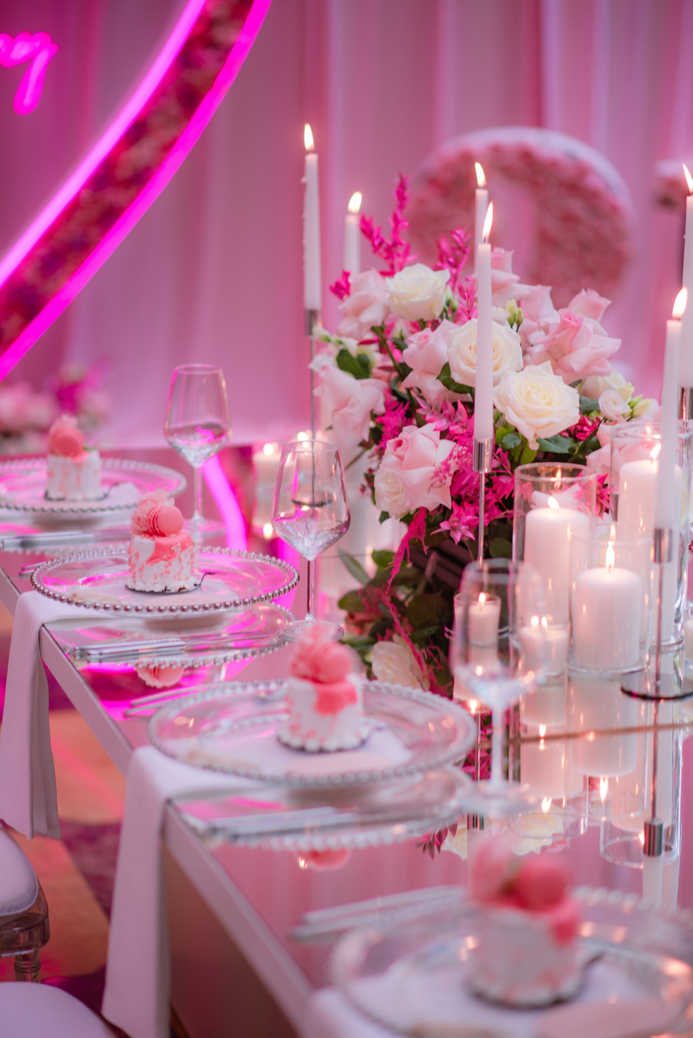 Step into a world of dazzling pink and romantic elegance for Arensa’s Birthday celebration! This stunning event features a central, vibrant pink neon heart sign, perfectly set against flowing pink drapery. The mirrored dining table creates a spectacular reflection of the exquisite decor. Guests were treated to an intimate setting with clear, ghost-style chairs and a breathtaking centerpiece arrangement of white and pale pink roses, interspersed with soft candlelight. Every detail, from the delicate floral touches on the individual place settings to the lush atmosphere, was designed to create an unforgettable, glamorous, and utterly chic birthday experience