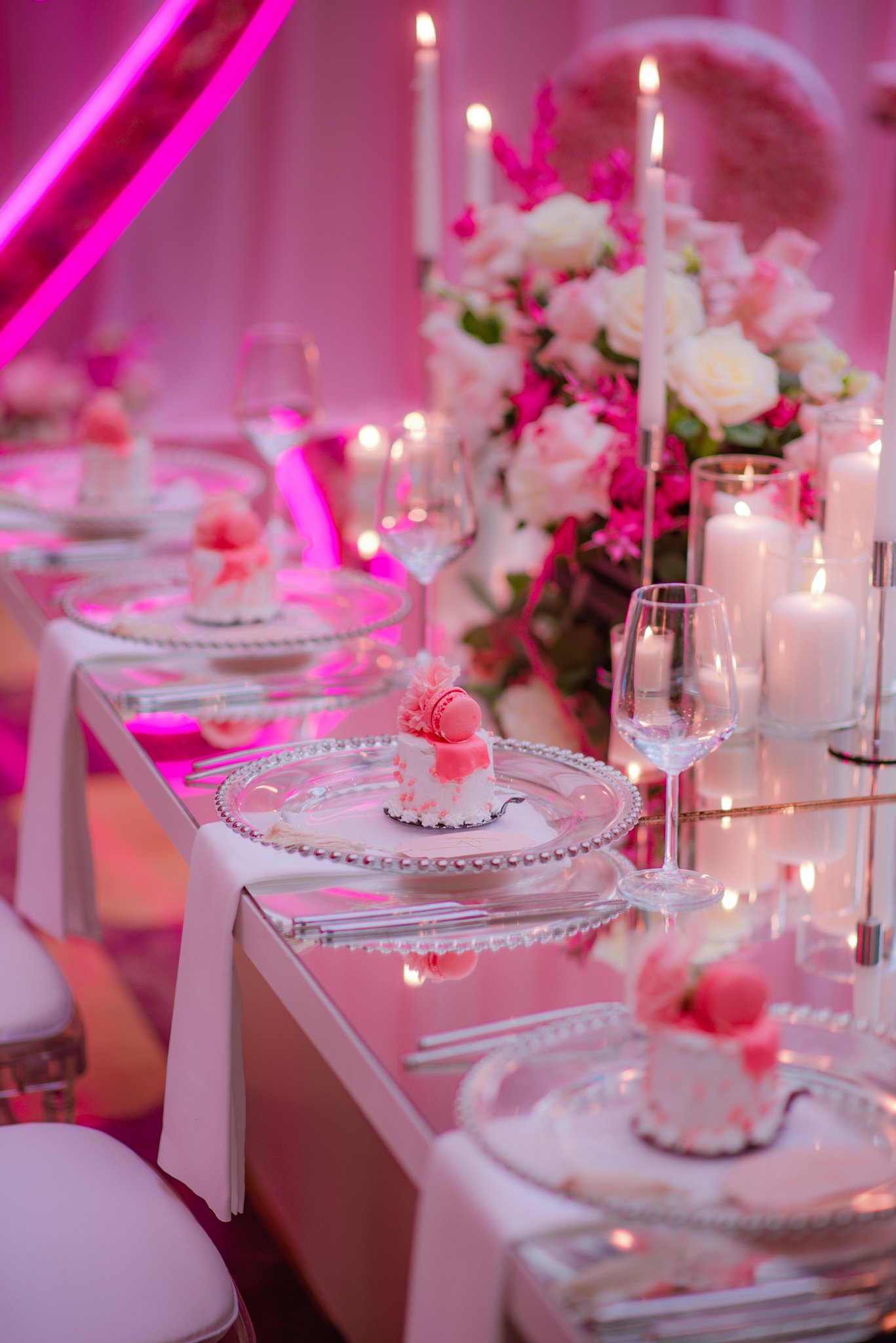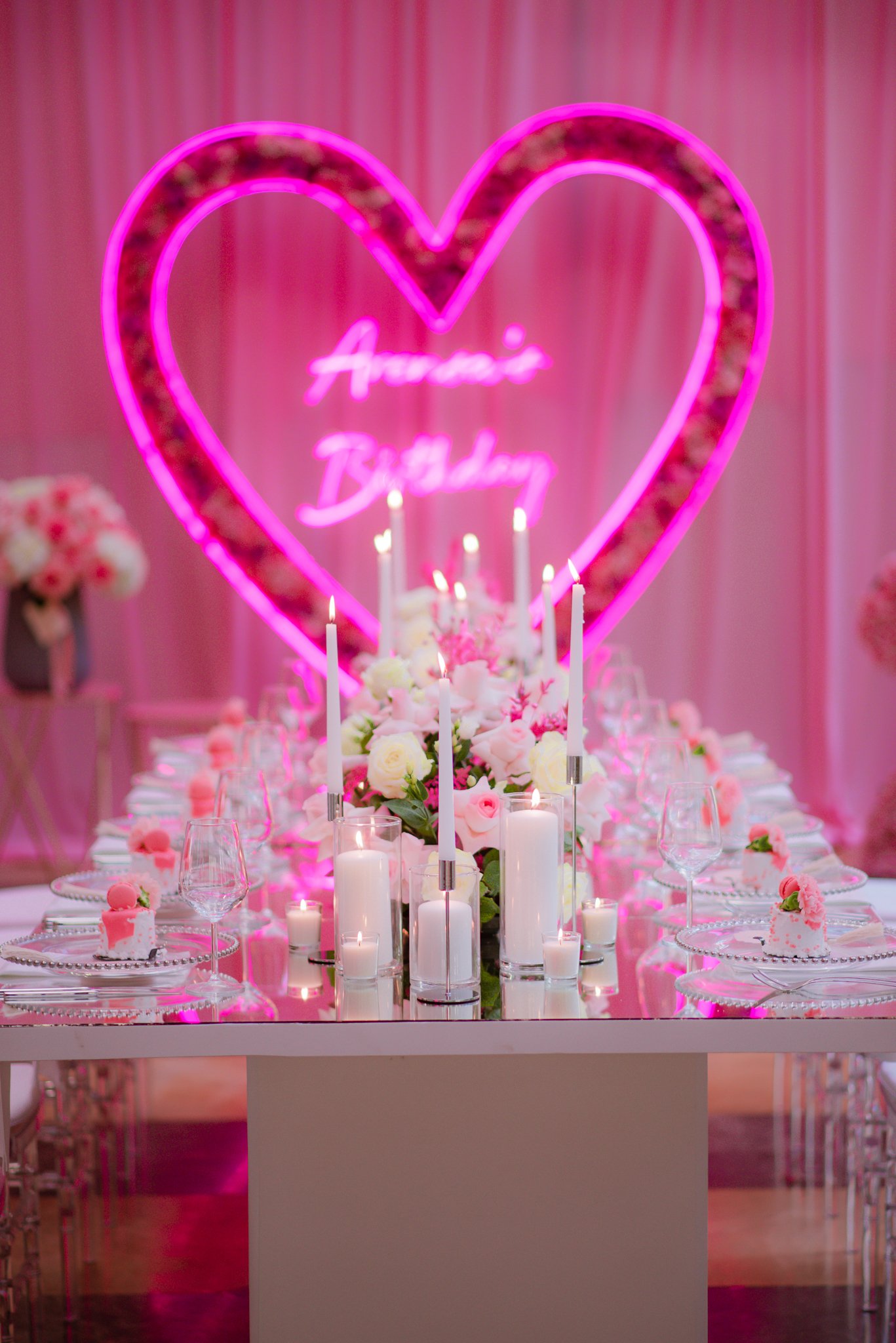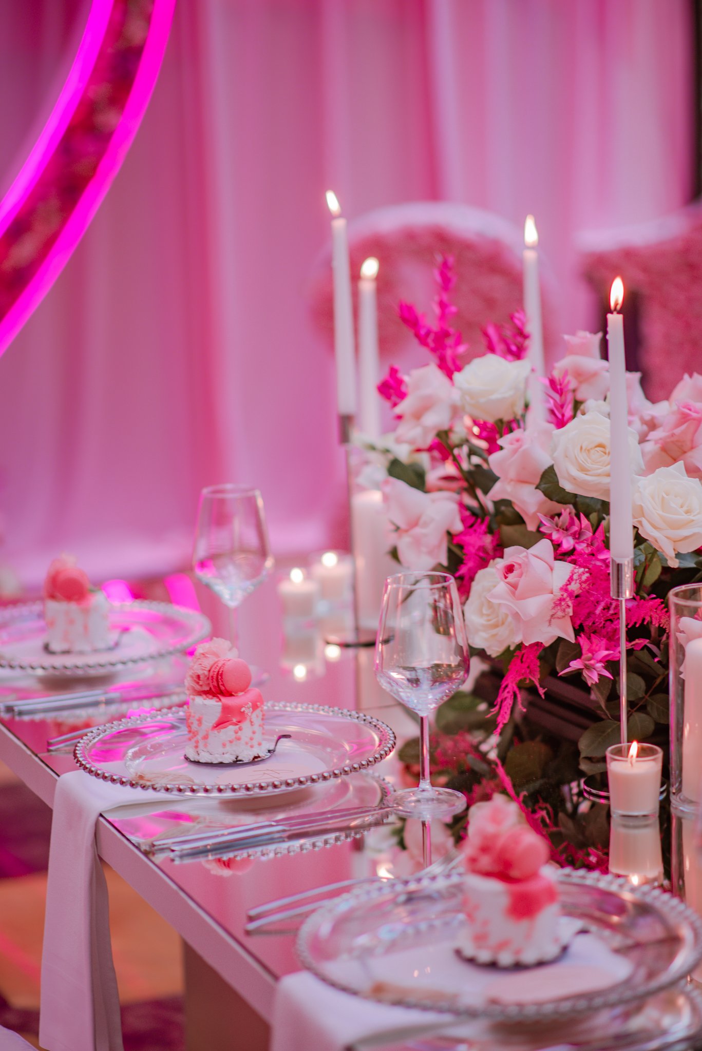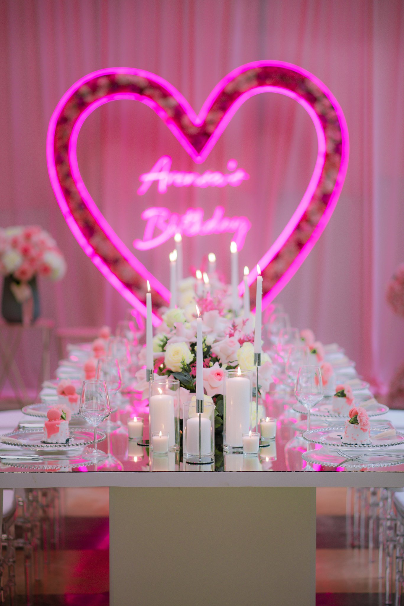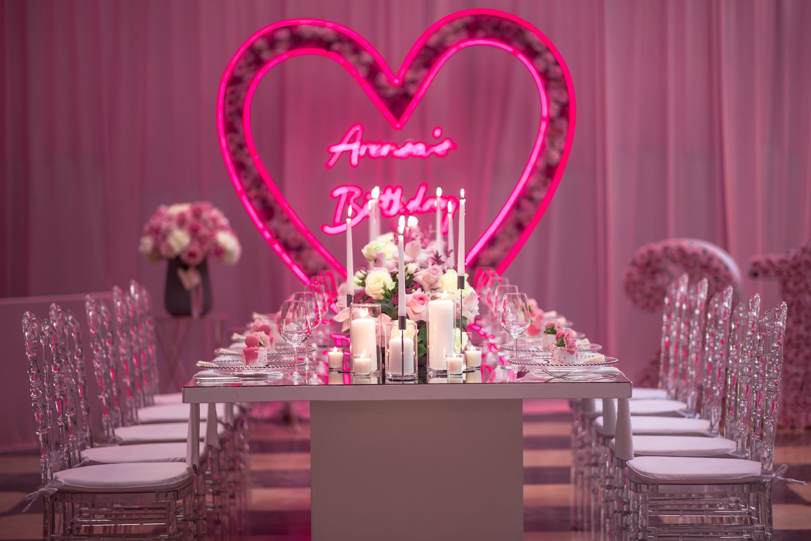 Step into a world of dazzling pink and romantic elegance for Arensa’s Birthday celebration! This stunning event features a central, vibrant pink neon heart sign, perfectly set against flowing pink drapery. The mirrored dining table creates a spectacular reflection of the exquisite decor. Guests were treated to an intimate setting with clear, ghost-style chairs and a breathtaking centerpiece arrangement of white and pale pink roses, interspersed with soft candlelight. Every detail, from the delicate floral touches on the individual place settings to the lush atmosphere, was designed to create an unforgettable, glamorous, and utterly chic birthday experience