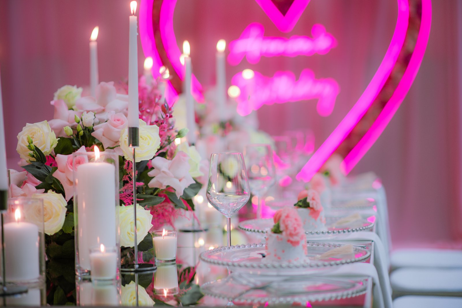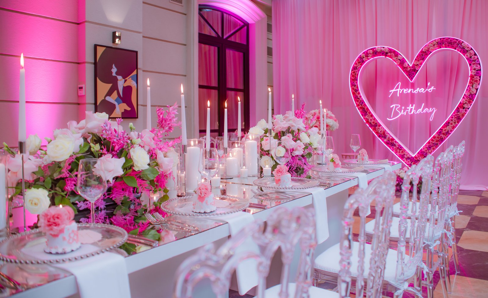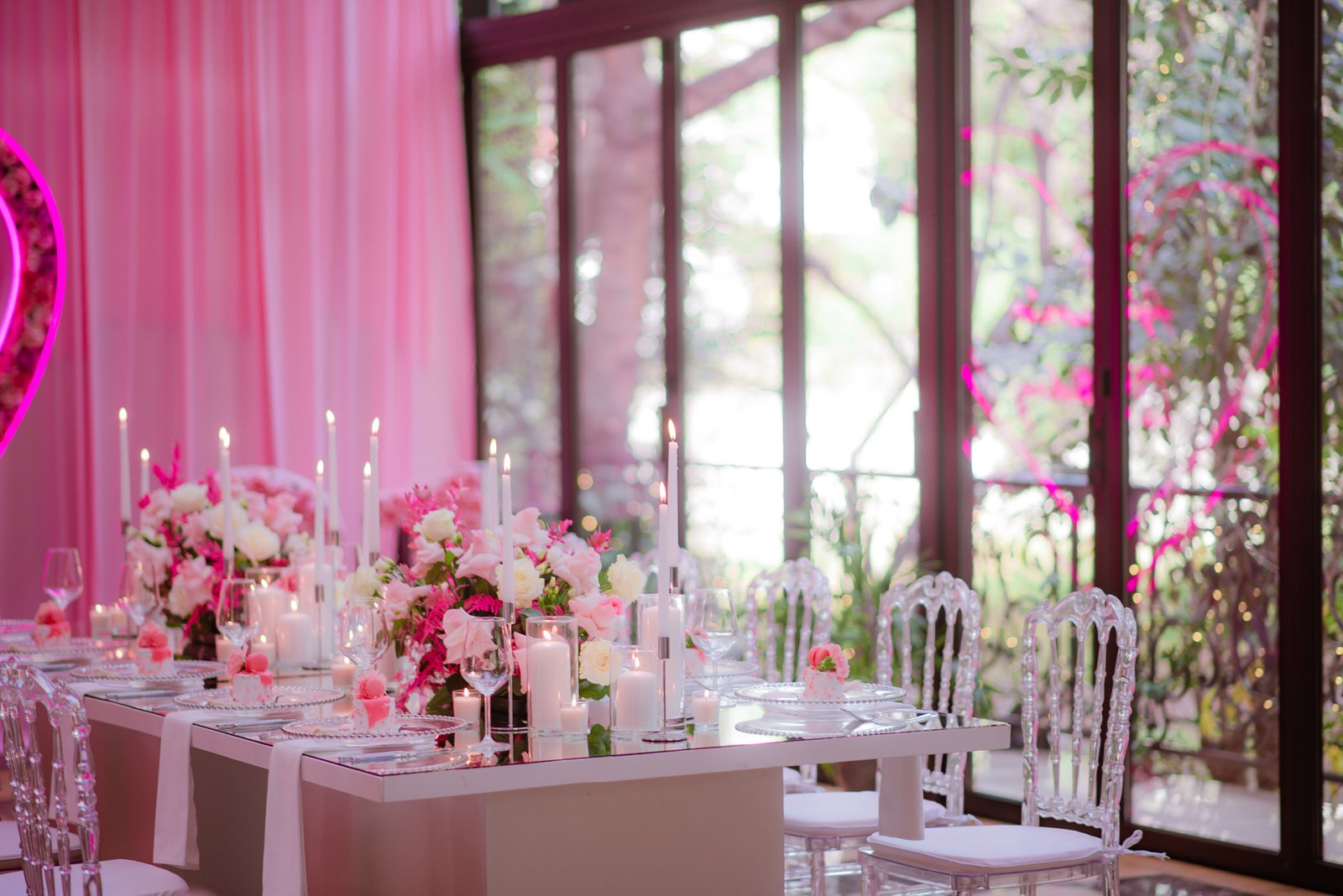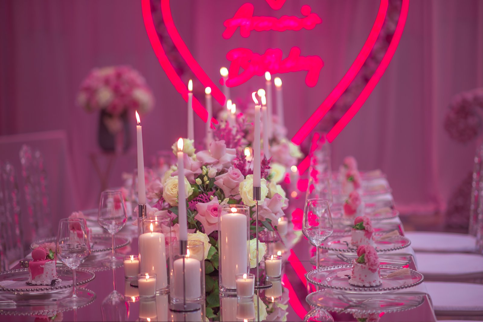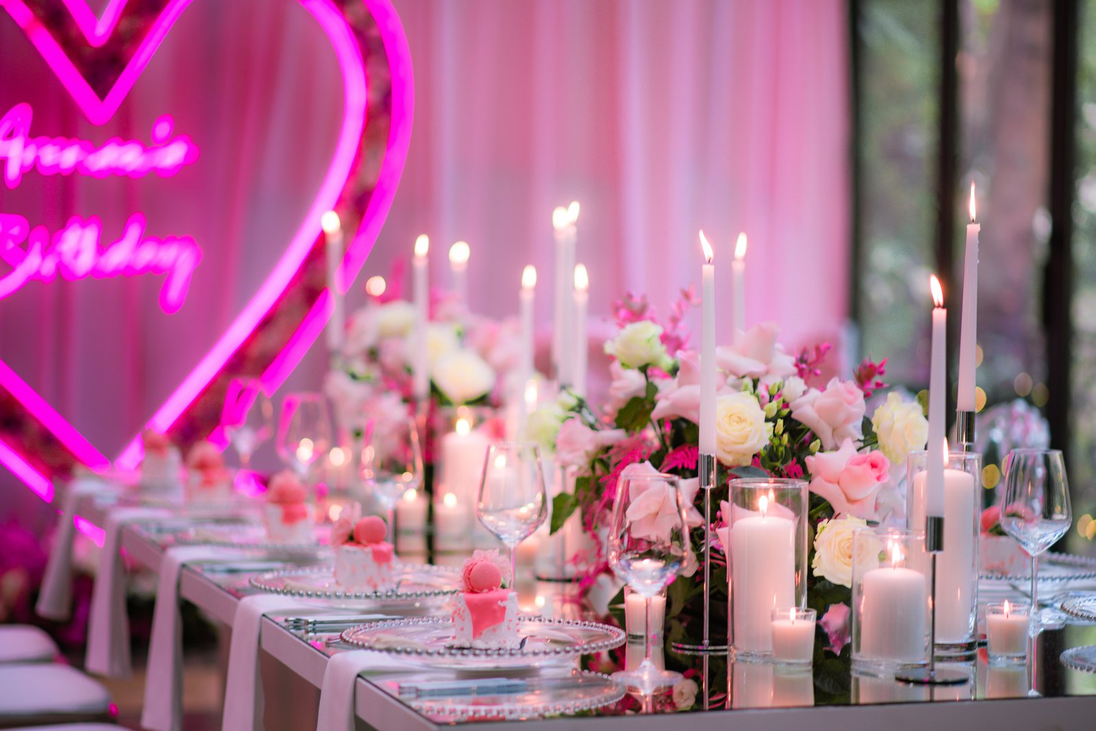 Step into a world of dazzling pink and romantic elegance for Arensa’s Birthday celebration! This stunning event features a central, vibrant pink neon heart sign, perfectly set against flowing pink drapery. The mirrored dining table creates a spectacular reflection of the exquisite decor. Guests were treated to an intimate setting with clear, ghost-style chairs and a breathtaking centerpiece arrangement of white and pale pink roses, interspersed with soft candlelight. Every detail, from the delicate floral touches on the individual place settings to the lush atmosphere, was designed to create an unforgettable, glamorous, and utterly chic birthday experience