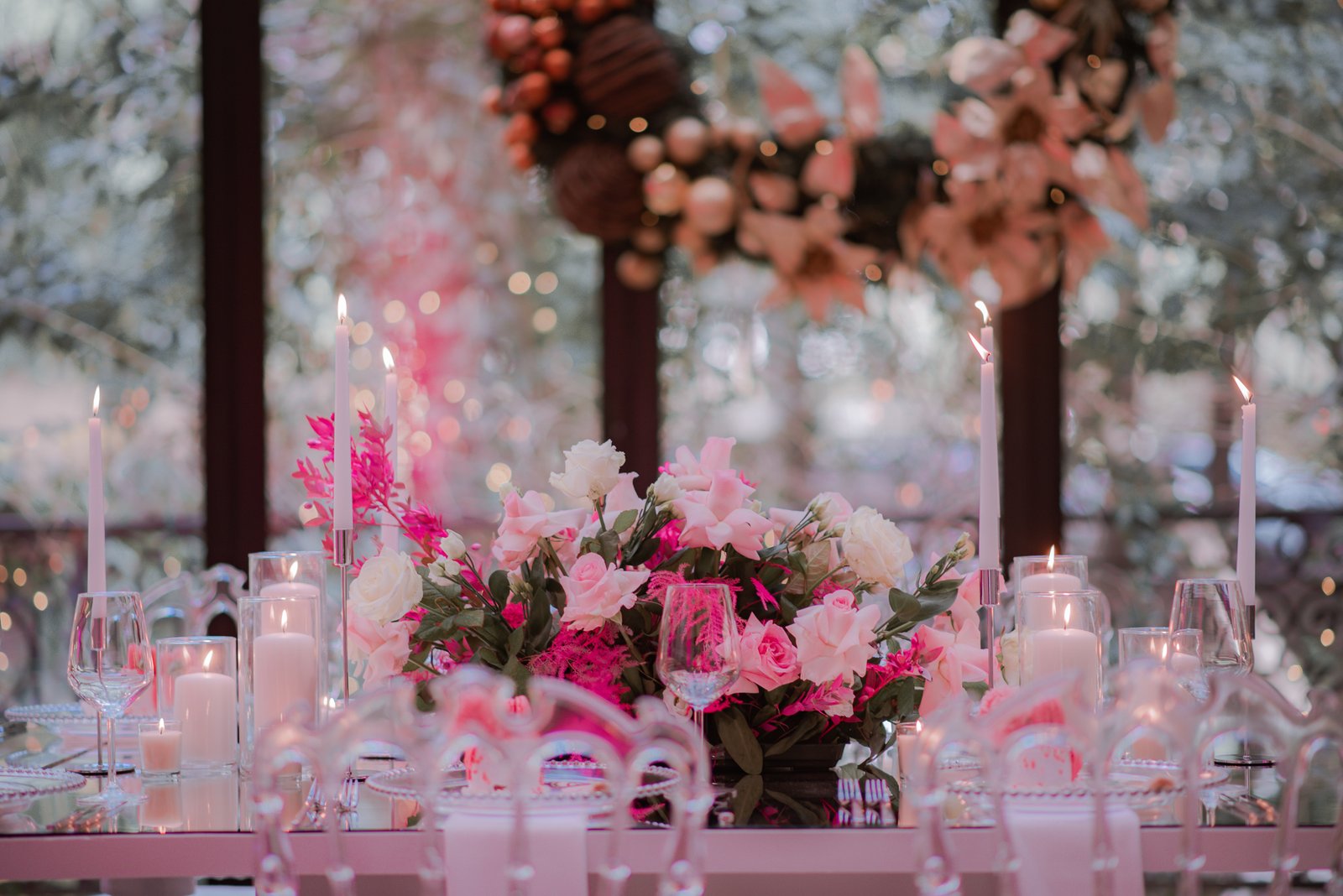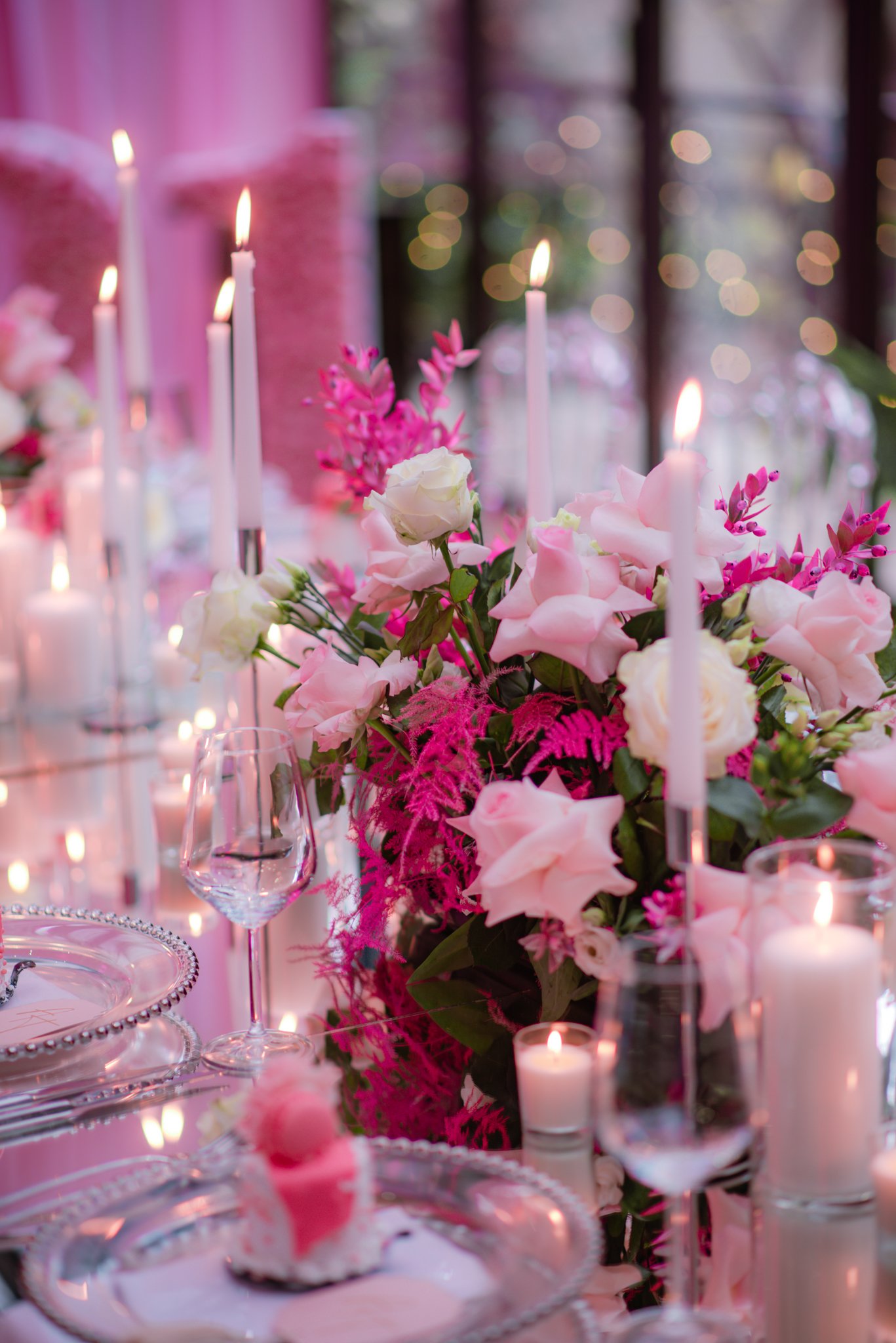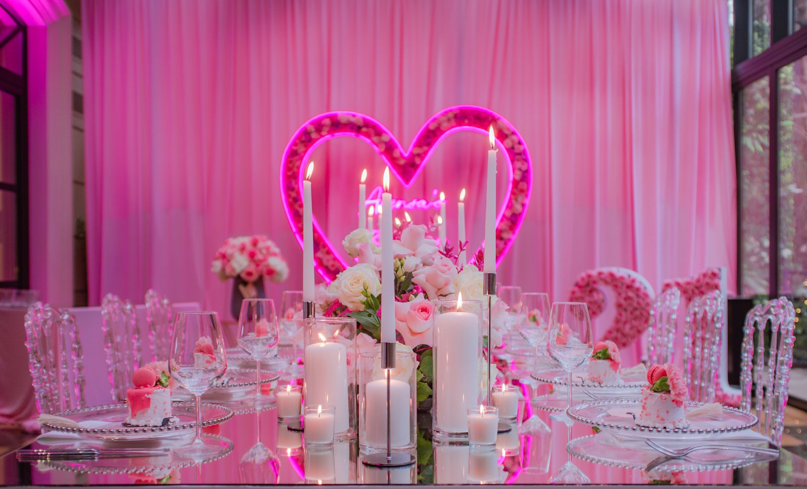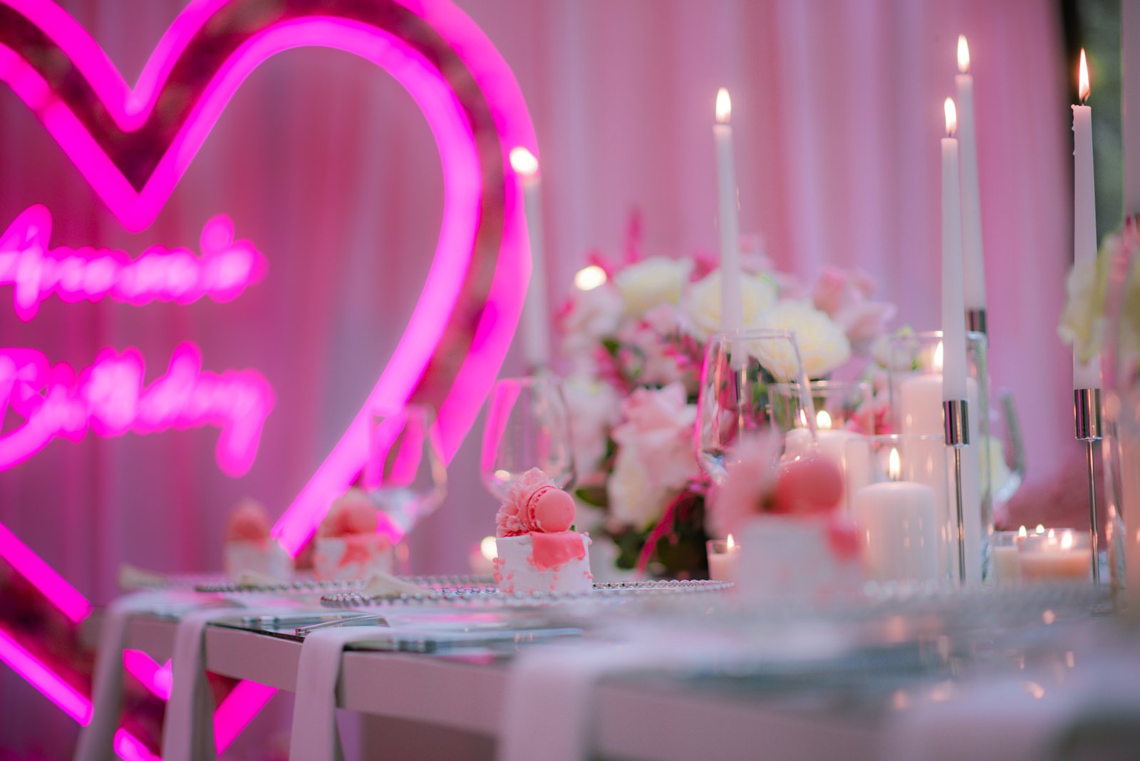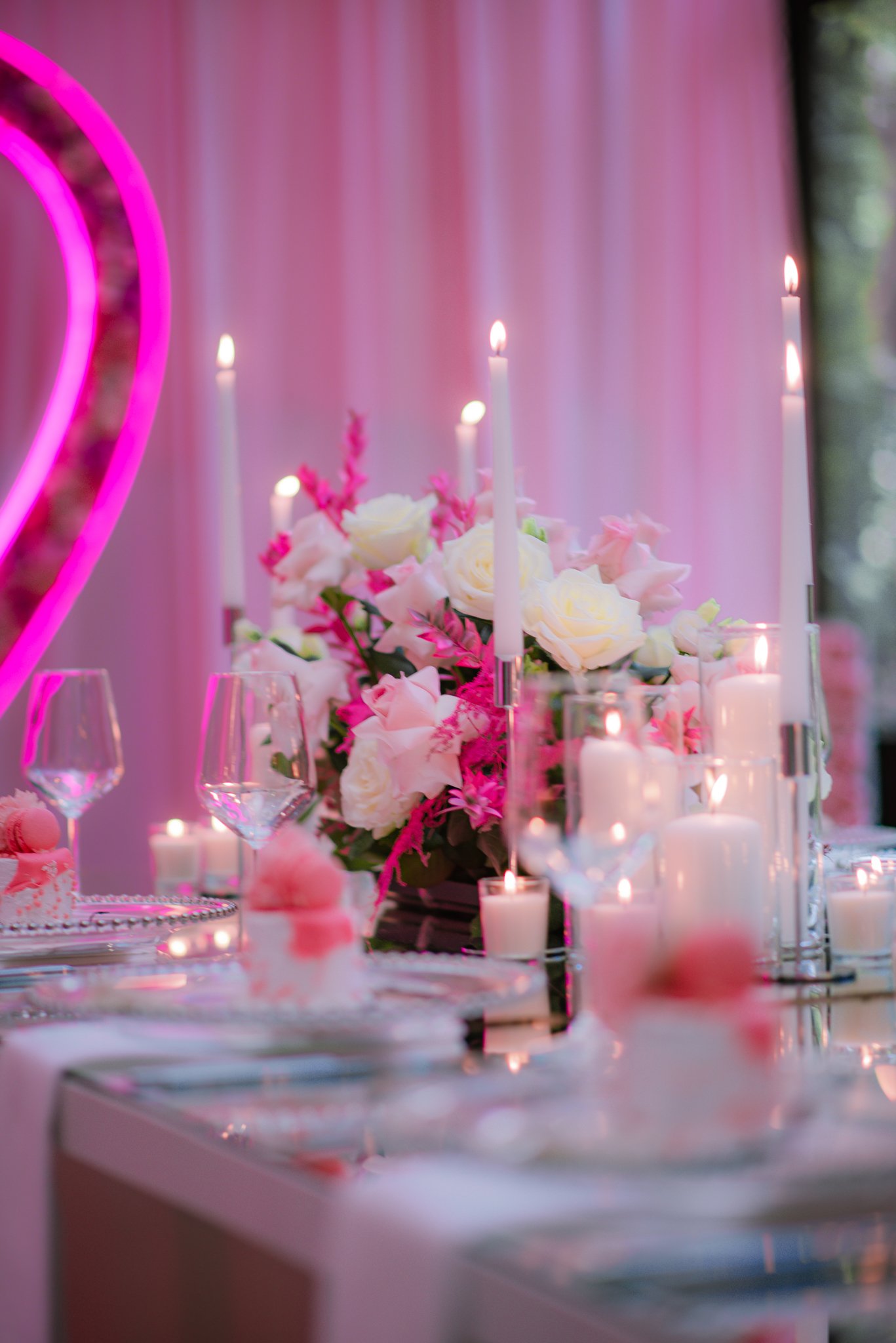 Step into a world of dazzling pink and romantic elegance for Arensa’s Birthday celebration! This stunning event features a central, vibrant pink neon heart sign, perfectly set against flowing pink drapery. The mirrored dining table creates a spectacular reflection of the exquisite decor. Guests were treated to an intimate setting with clear, ghost-style chairs and a breathtaking centerpiece arrangement of white and pale pink roses, interspersed with soft candlelight. Every detail, from the delicate floral touches on the individual place settings to the lush atmosphere, was designed to create an unforgettable, glamorous, and utterly chic birthday experience