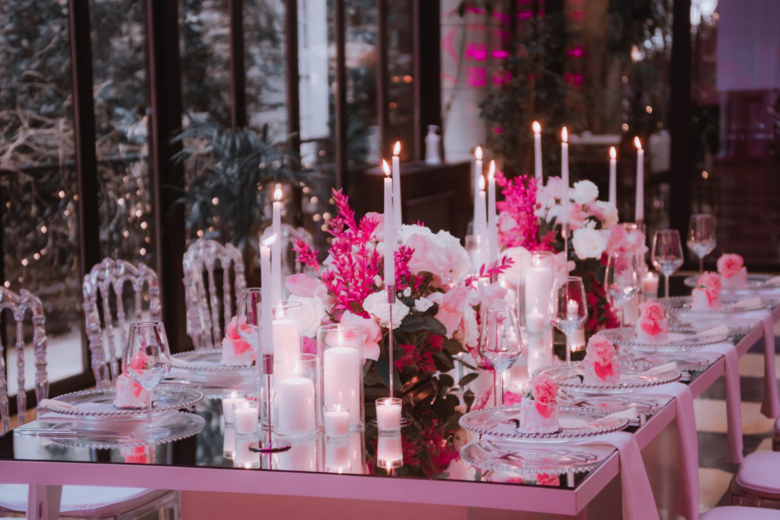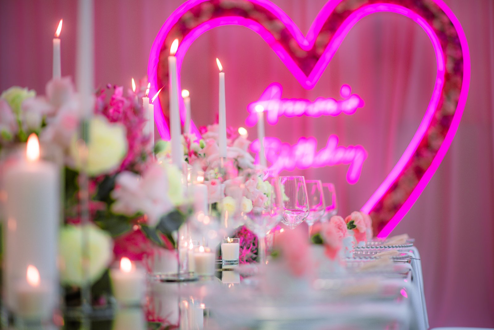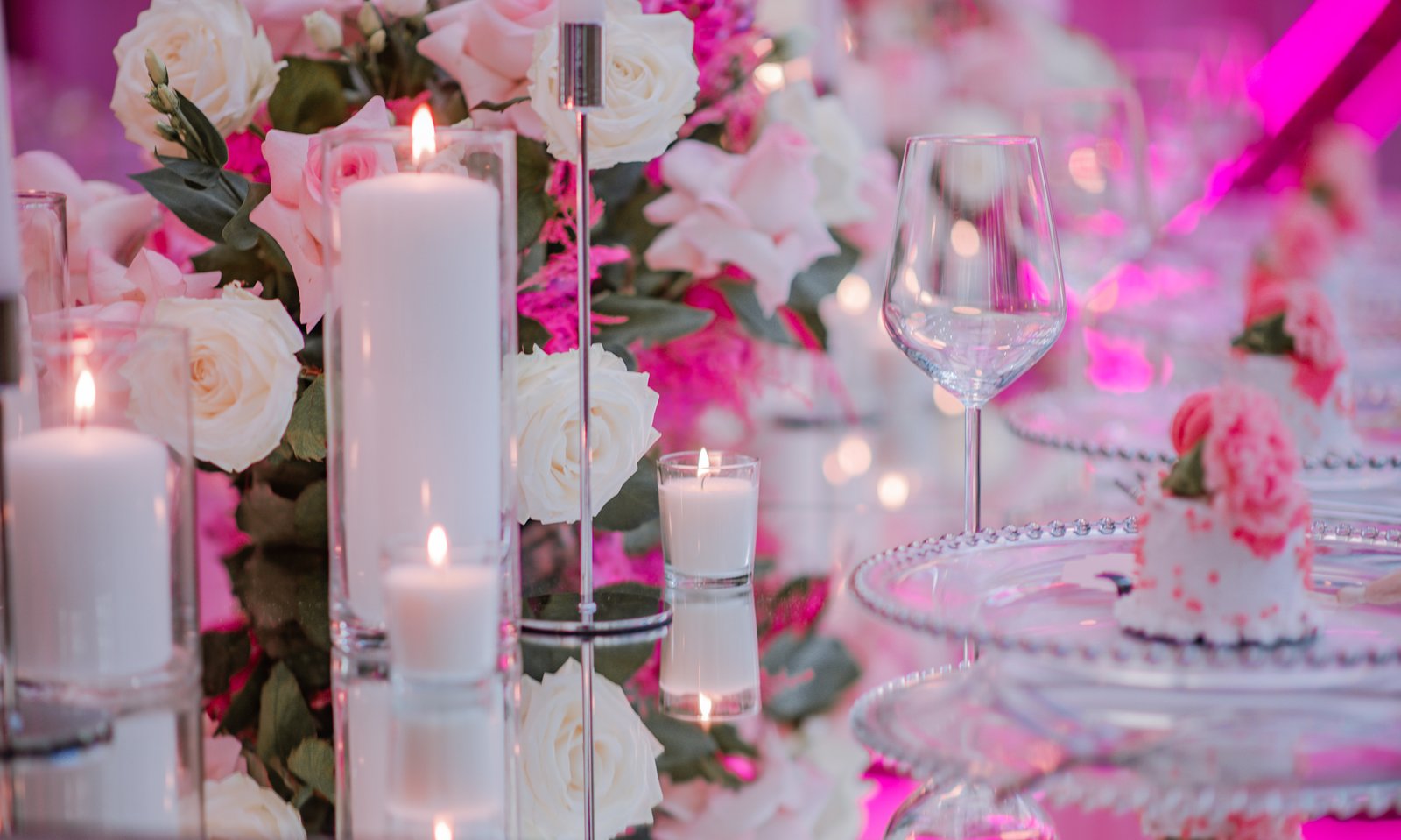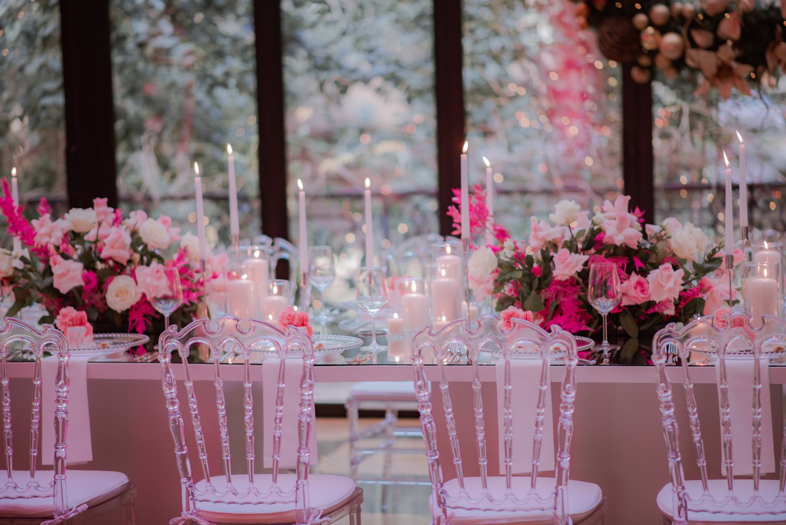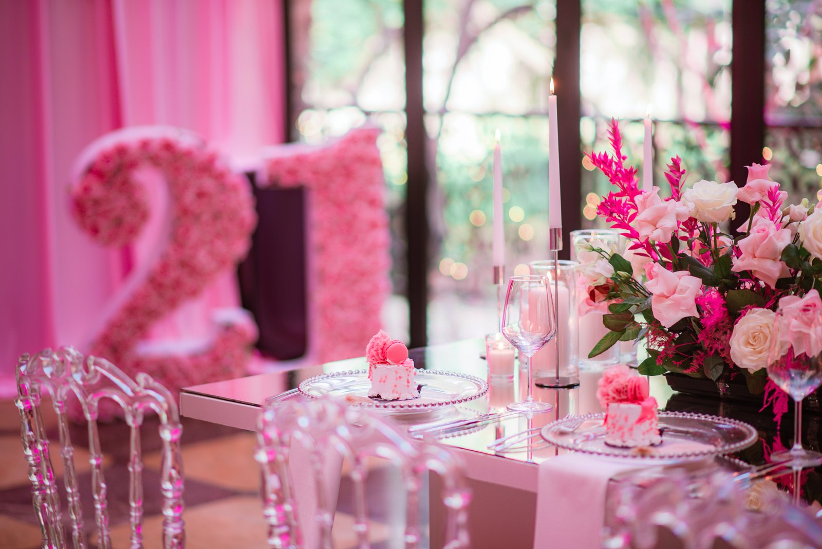 Step into a world of dazzling pink and romantic elegance for Arensa’s Birthday celebration! This stunning event features a central, vibrant pink neon heart sign, perfectly set against flowing pink drapery. The mirrored dining table creates a spectacular reflection of the exquisite decor. Guests were treated to an intimate setting with clear, ghost-style chairs and a breathtaking centerpiece arrangement of white and pale pink roses, interspersed with soft candlelight. Every detail, from the delicate floral touches on the individual place settings to the lush atmosphere, was designed to create an unforgettable, glamorous, and utterly chic birthday experience