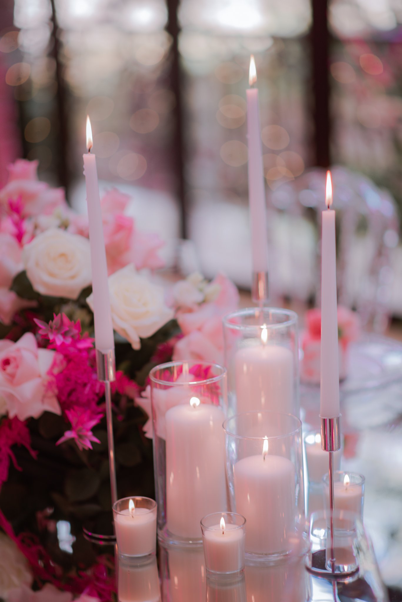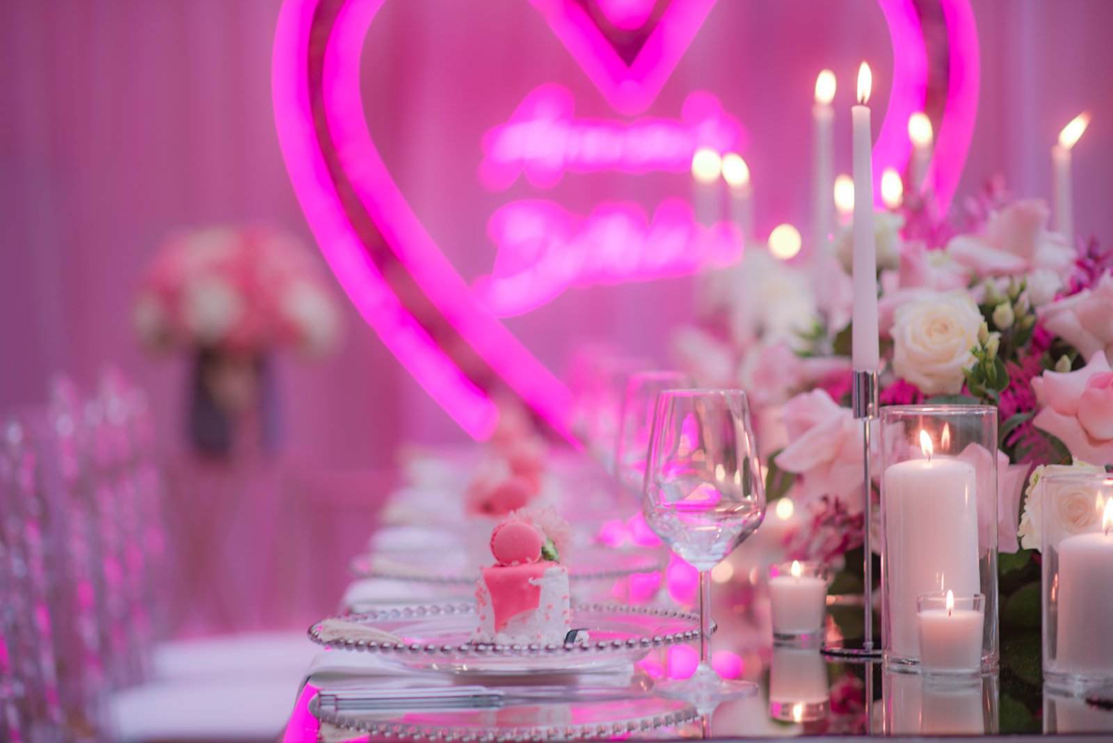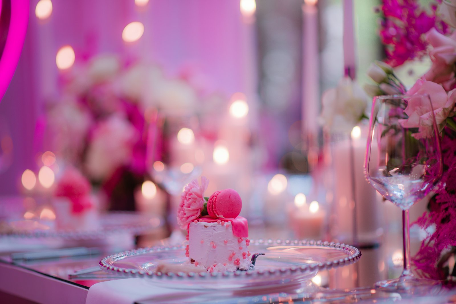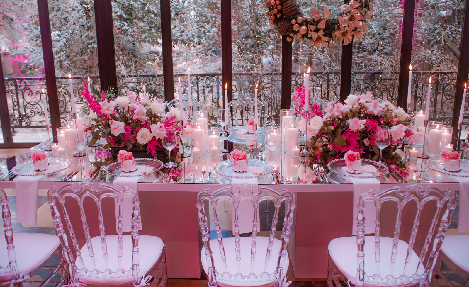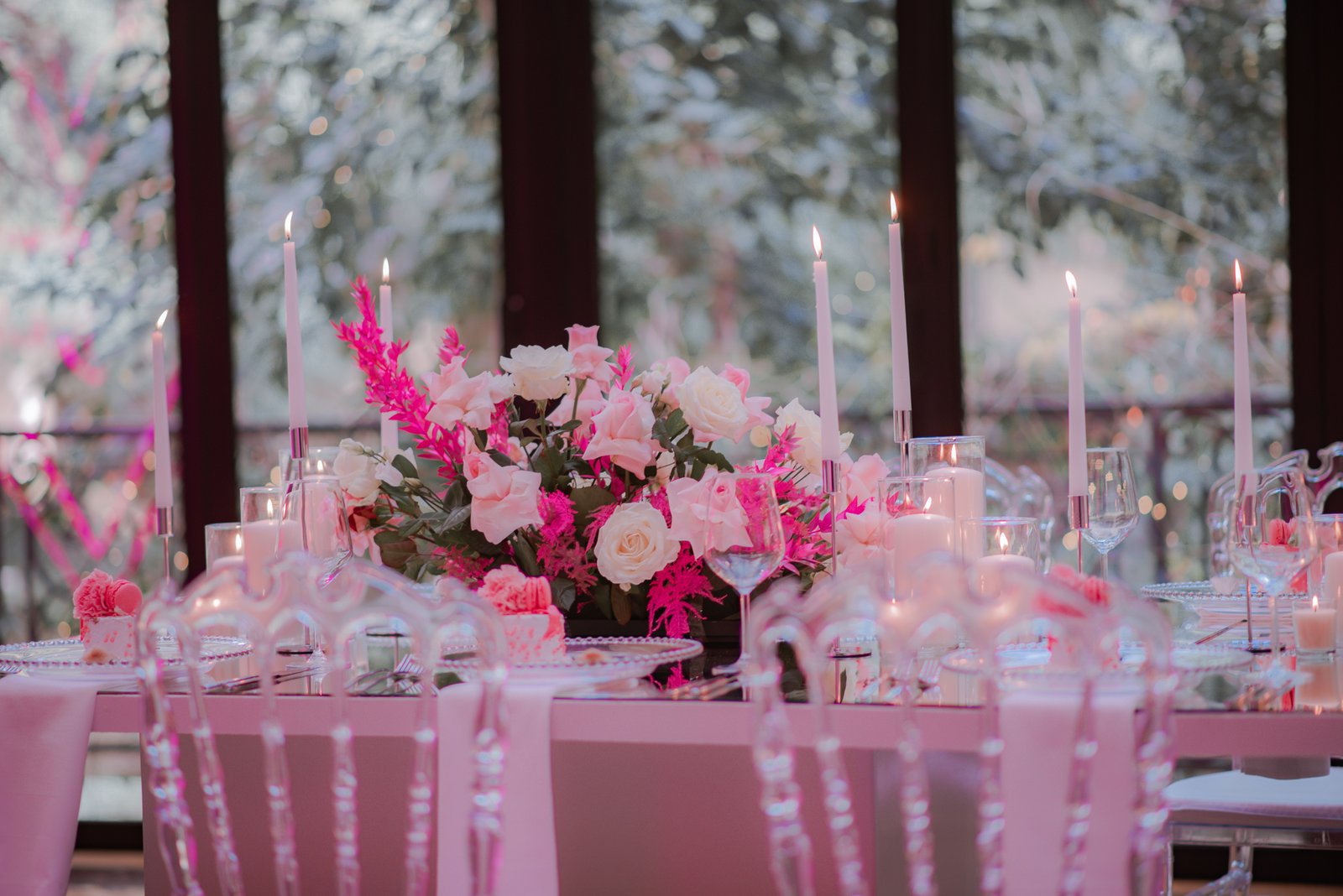 Step into a world of dazzling pink and romantic elegance for Arensa’s Birthday celebration! This stunning event features a central, vibrant pink neon heart sign, perfectly set against flowing pink drapery. The mirrored dining table creates a spectacular reflection of the exquisite decor. Guests were treated to an intimate setting with clear, ghost-style chairs and a breathtaking centerpiece arrangement of white and pale pink roses, interspersed with soft candlelight. Every detail, from the delicate floral touches on the individual place settings to the lush atmosphere, was designed to create an unforgettable, glamorous, and utterly chic birthday experience
