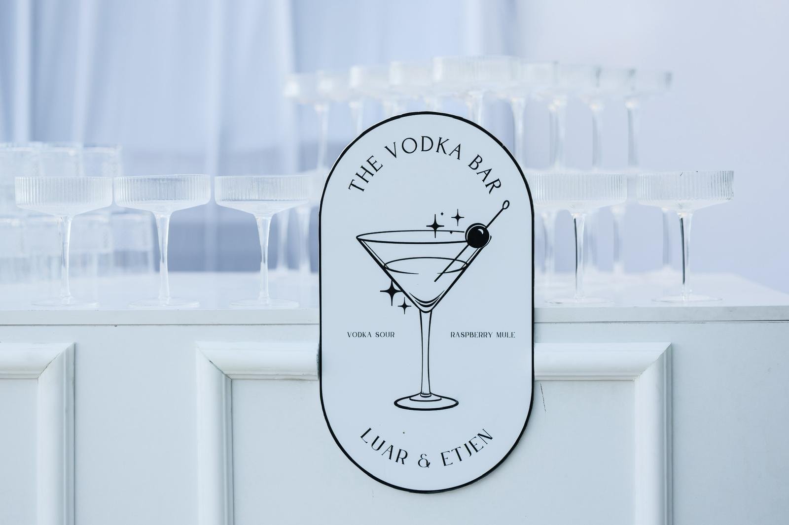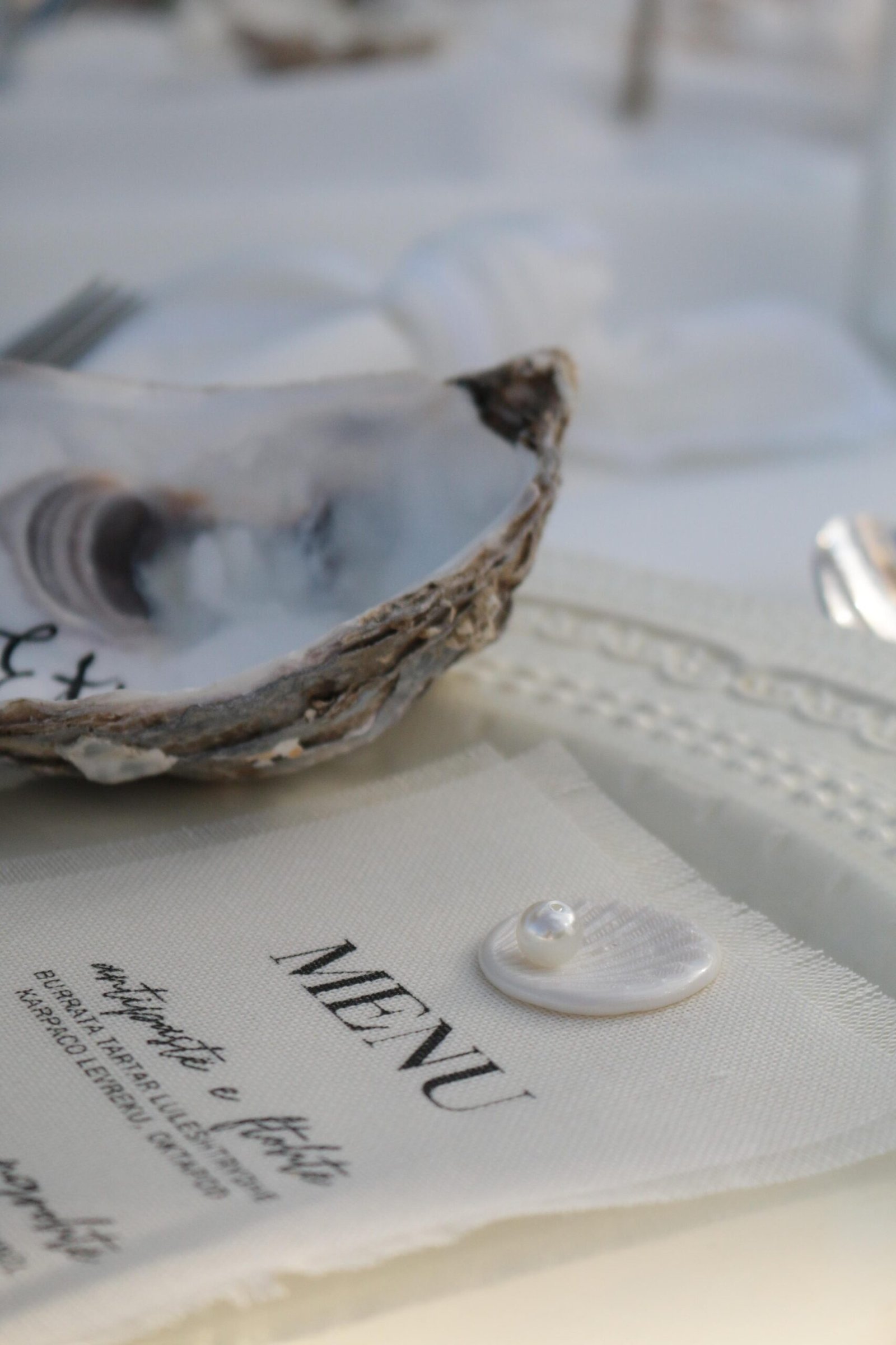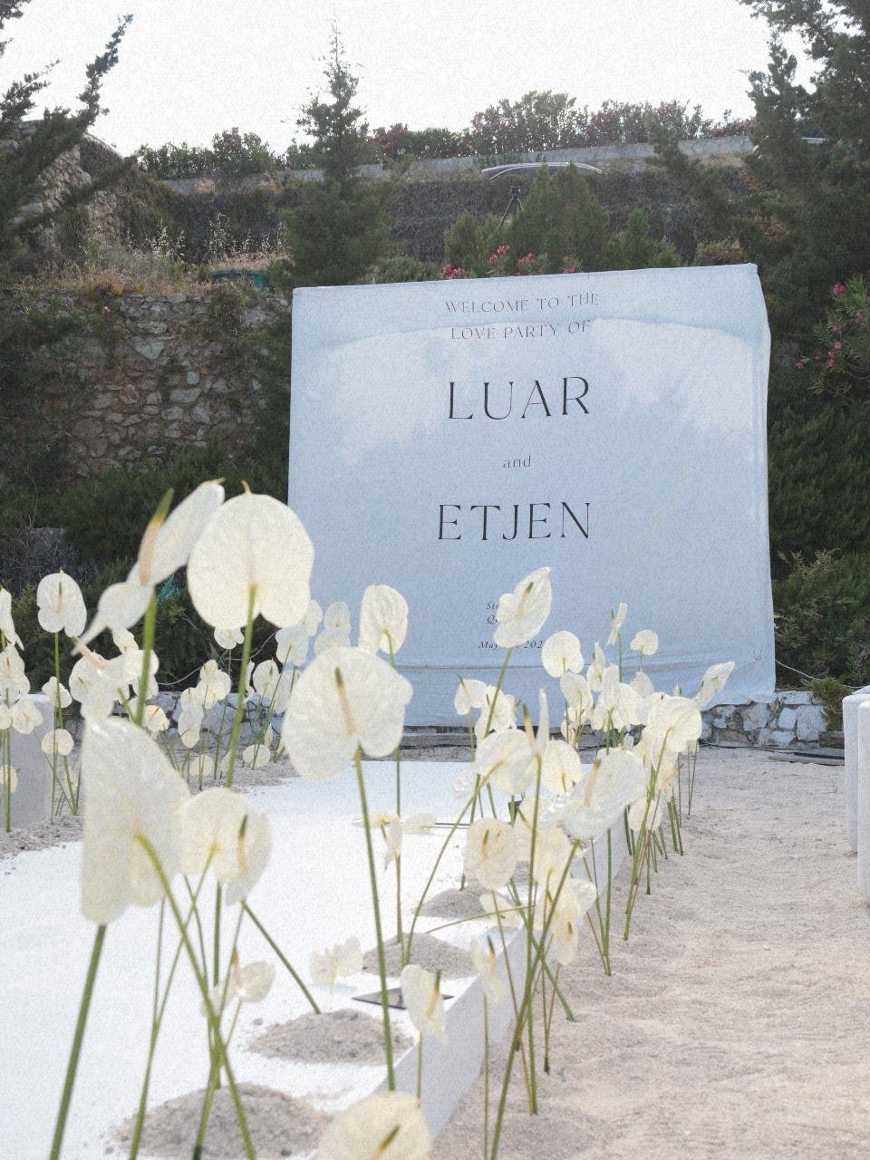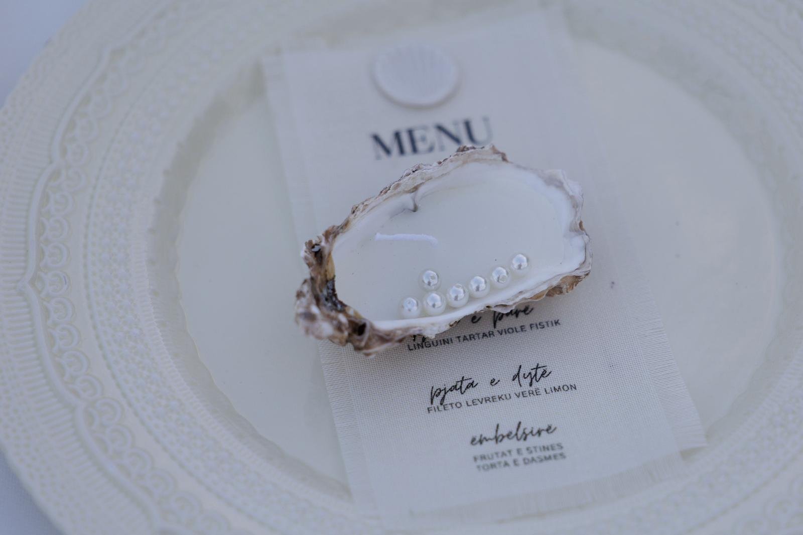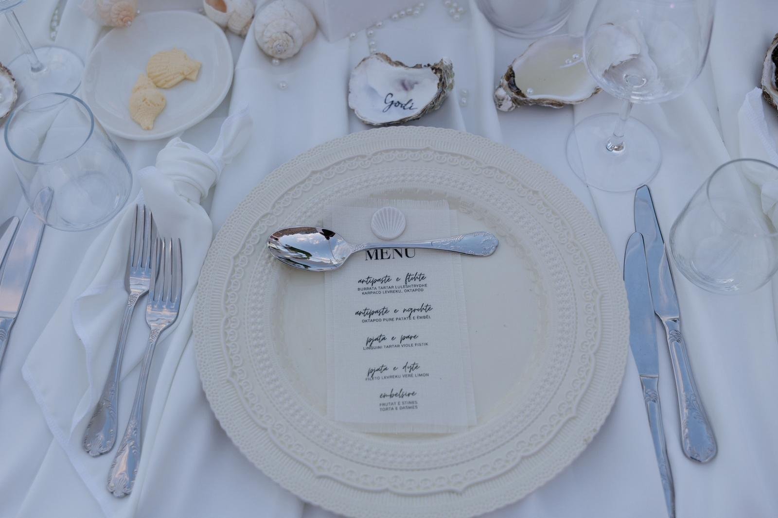 We created a serene atmosphere with an all-white theme, evident in the guest book, florals, and reception setup. The personalized Vodka Bar and unique menu, featuring dishes like Fileto Levreku (Sea Bass Fillet), added bespoke touches. From the personalized cake cutter to the gorgeous seaside welcome sign, every detail ensured their wedding was flawlessly executed and truly unforgettable.