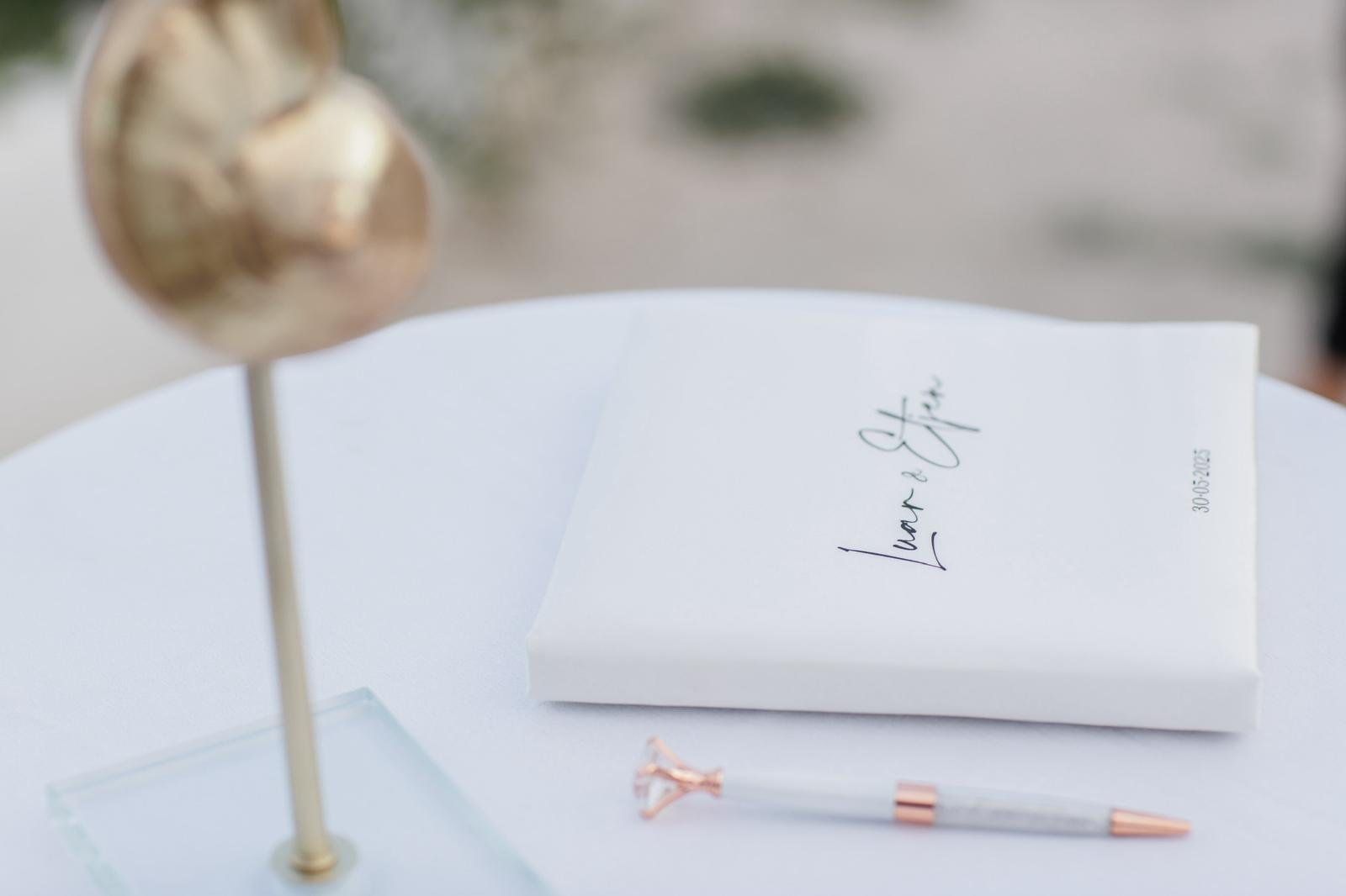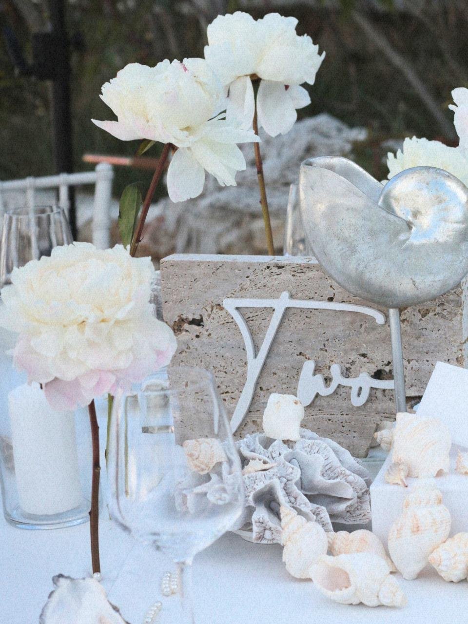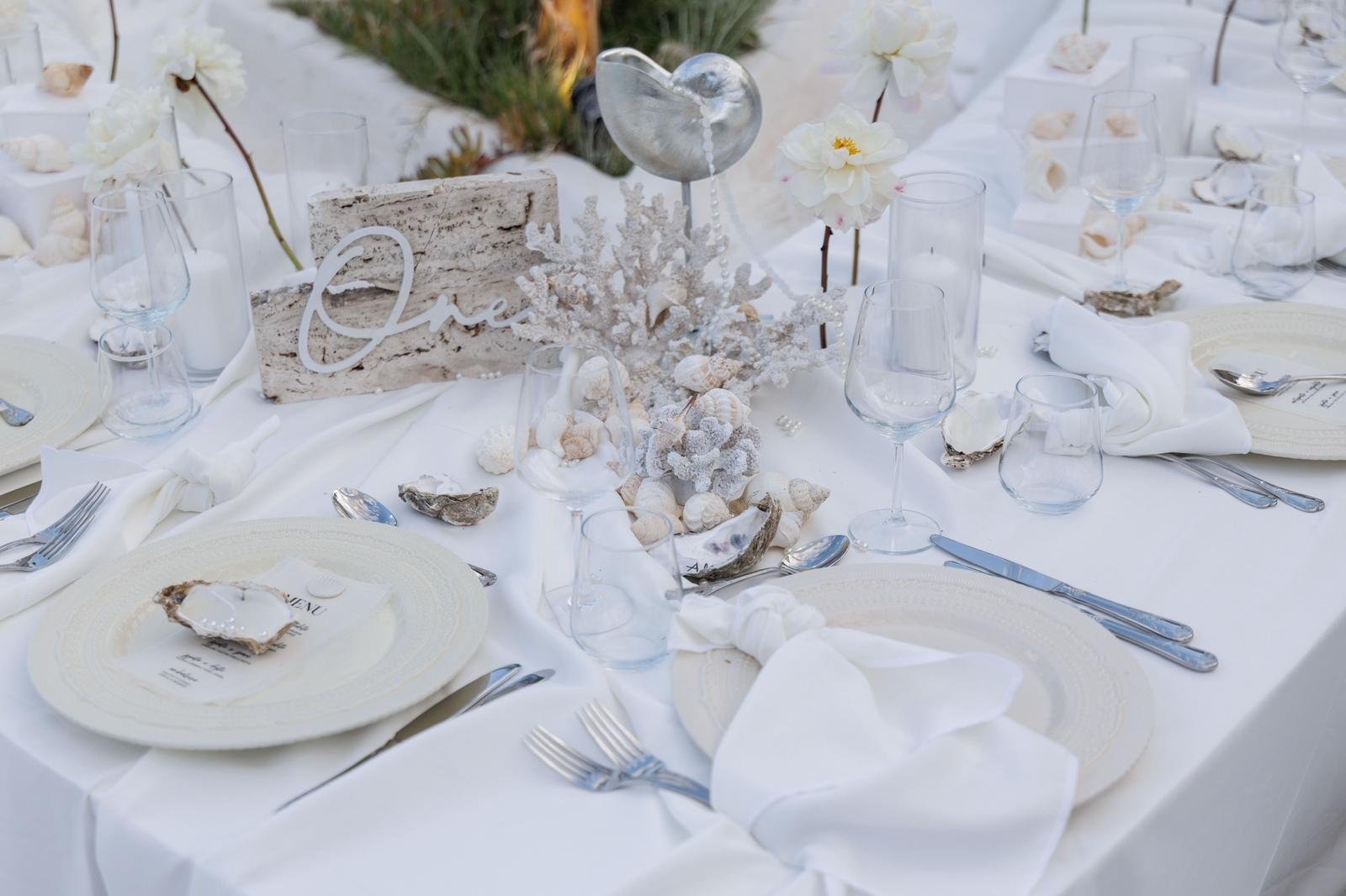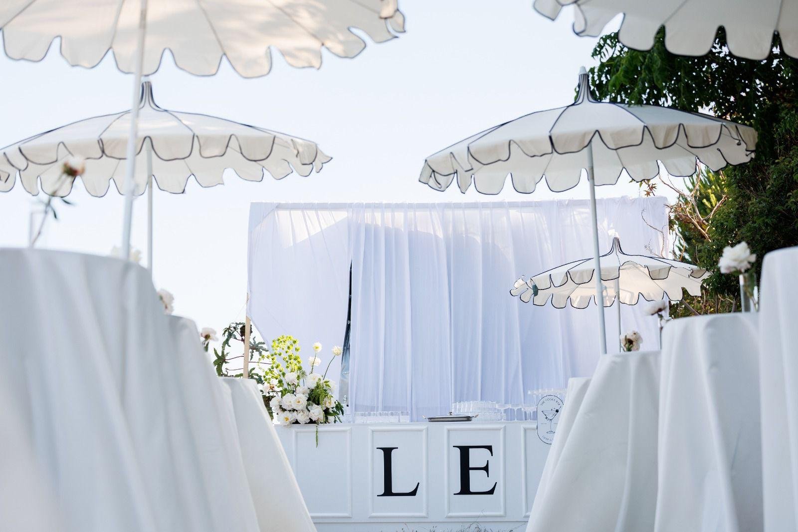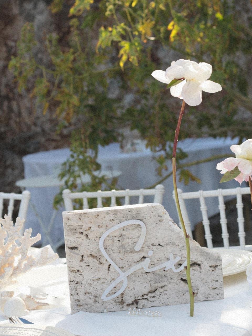 We created a serene atmosphere with an all-white theme, evident in the guest book, florals, and reception setup. The personalized Vodka Bar and unique menu, featuring dishes like Fileto Levreku (Sea Bass Fillet), added bespoke touches. From the personalized cake cutter to the gorgeous seaside welcome sign, every detail ensured their wedding was flawlessly executed and truly unforgettable.